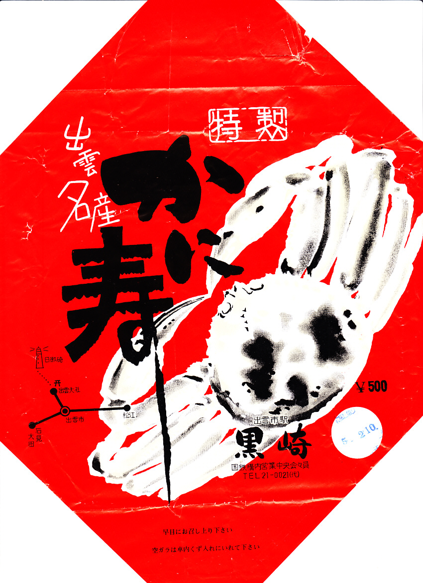 1976(昭和51)年5月2日10時の調製と思われる、昔の出雲市駅弁の掛紙。赤い掛紙に白いカニを描く。小さな路線略図のとおり、1990年までは大社線で乗り換えなく、出雲市駅から出雲大社まで鉄道で行けた。