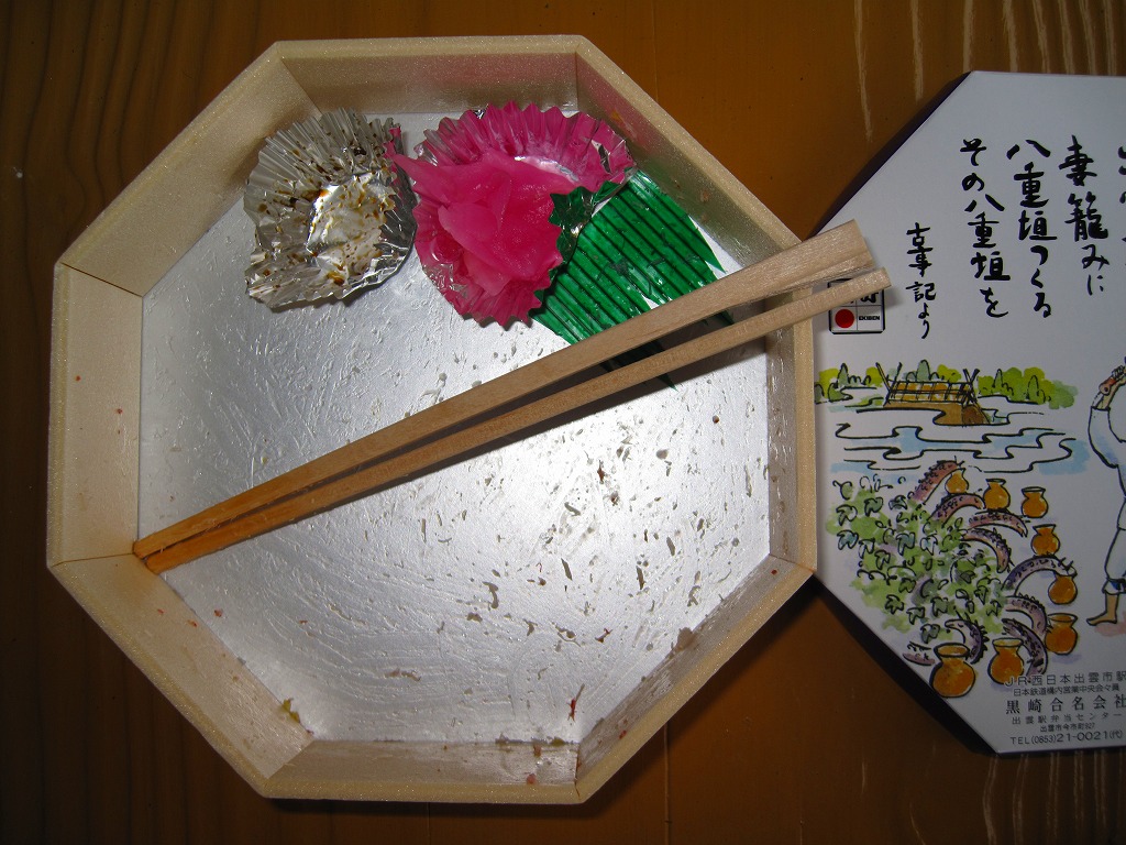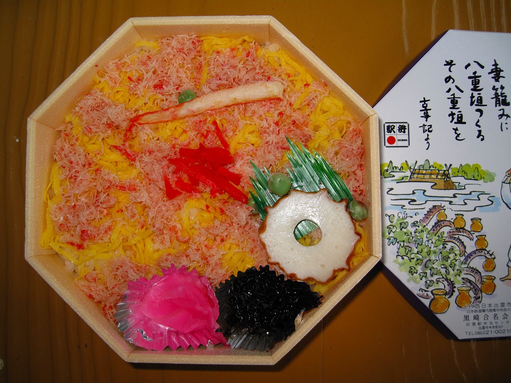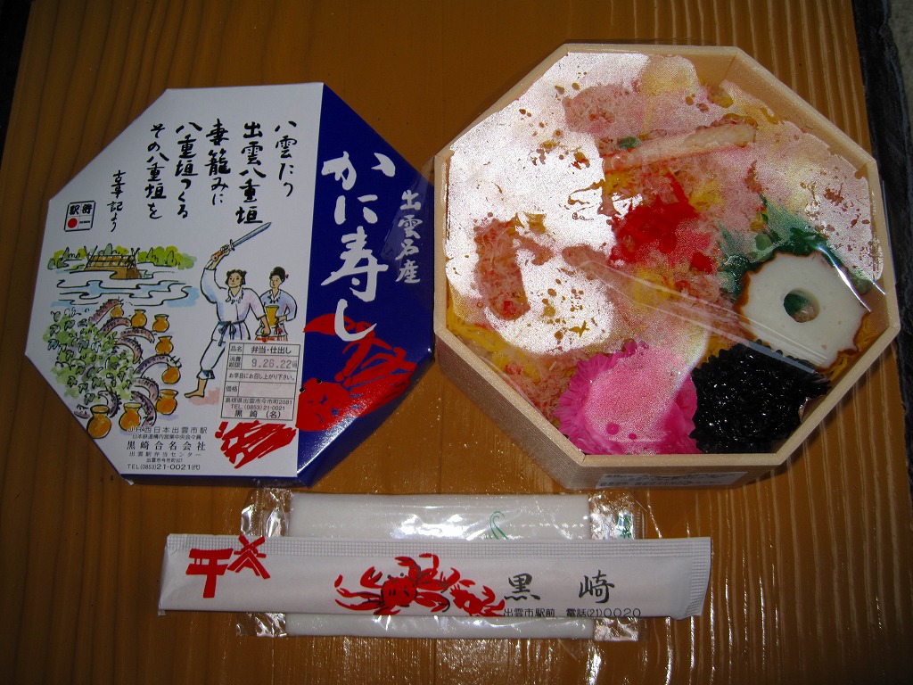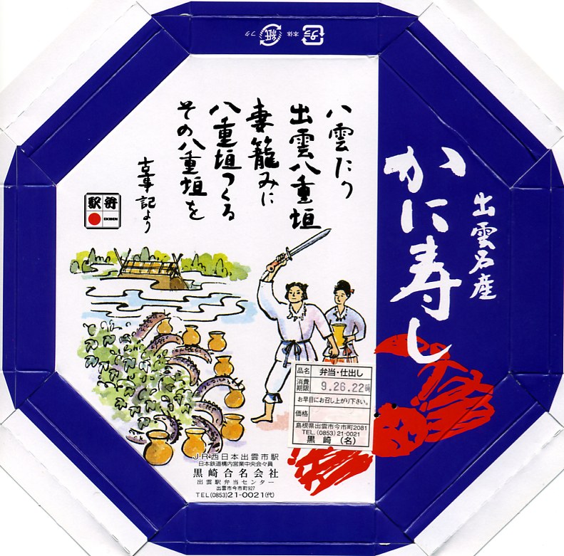 昭和40年代までには発売。正八角形の容器に、古代人や大社などを描いたボール紙のふたをして、輪ゴム2本で十字に留める。中身は酢飯の上にカニのほぐし身と錦糸卵を敷き詰め、カマボコやグリーンピースなどを添えるもの。かつて山陰本線の主要駅に軒並み備わっていたカニ駅弁のひとつであり、しかし好評も不評もあまり聞かない地味な存在である。価格は2009年の購入時で920円、2015年時点で940円。駅弁屋が食堂ごと撤退し、2018(平成30)年9月に終売。