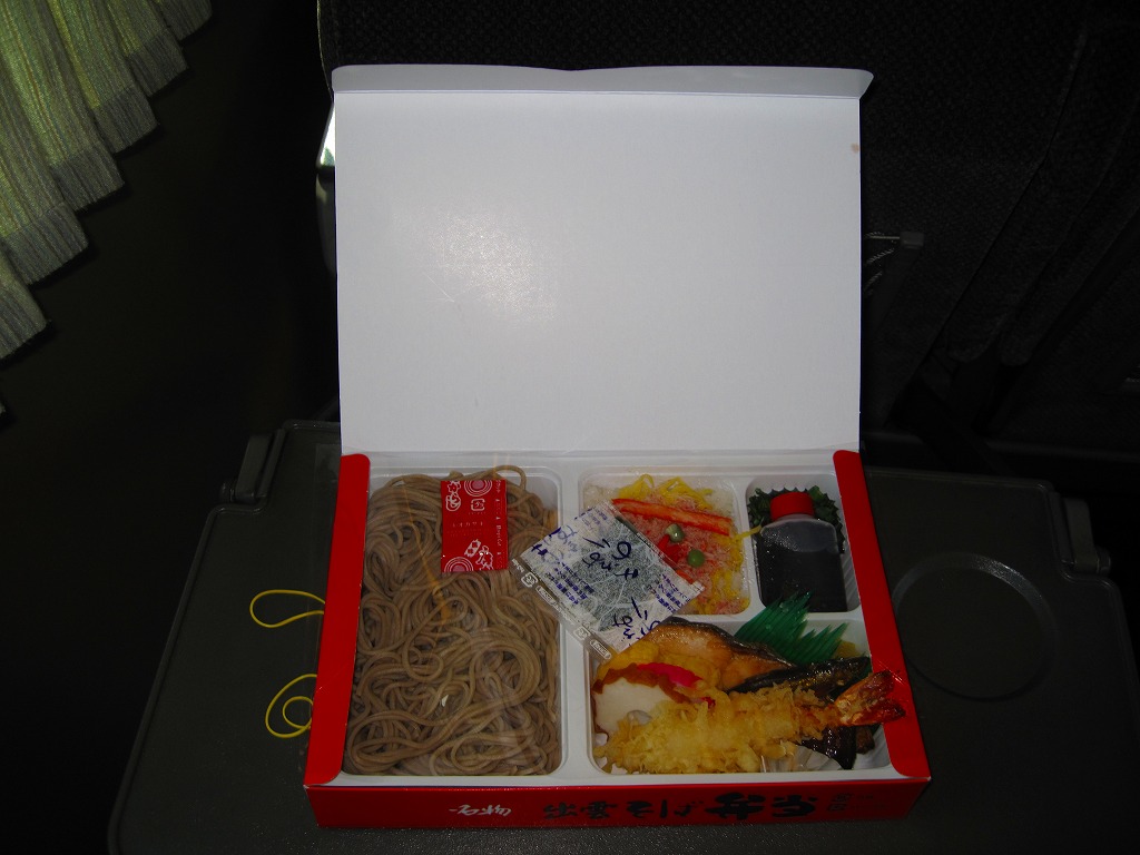 1960年代に「手打そば弁当」の名で発売か。簡単な路線図と出雲大社や商品名などを描いたボール紙製の専用容器を使用、中身は4割がそば、3割がおかずで海老天、焼マス、カマボコ、玉子焼、ワカサギ甘露煮など、2割がかにちらしずし、1割がめんつゆのボトルと刻みネギ。出雲の名物であるそばと、出雲駅弁の名物であるかにずしが同時にいただける。価格は2009年の購入時で1,050円、2014年4月の消費税率改定で1,080円。駅弁屋が食堂ごと撤退し、2018(平成30)年9月に終売。