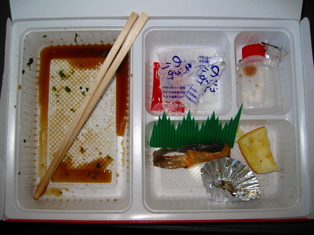 白く柔らかいプラ製トレーを2個詰めたボール紙製容器を使用、そのふたには駅を中心とした周辺の名所がイラストで描かれる。中身は日の丸御飯に鶏肉煮、白身魚フライ、焼サバ、ウインナー、玉子焼、カマボコ、スパゲティサラダ、オレンジなど。500円でこれだけ入っているのなら上出来だが、内容も品質も昭和の昔懐かしい幕の内駅弁で、駅弁ファン以外の心をつかめるかどうか。この駅弁は予約制とされるが、訪問時には売店で普通に買えた。駅弁屋が食堂ごと撤退し、2018(平成30)年9月に終売。