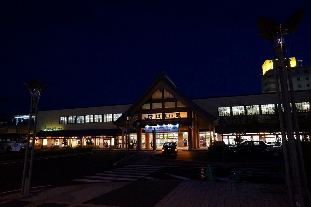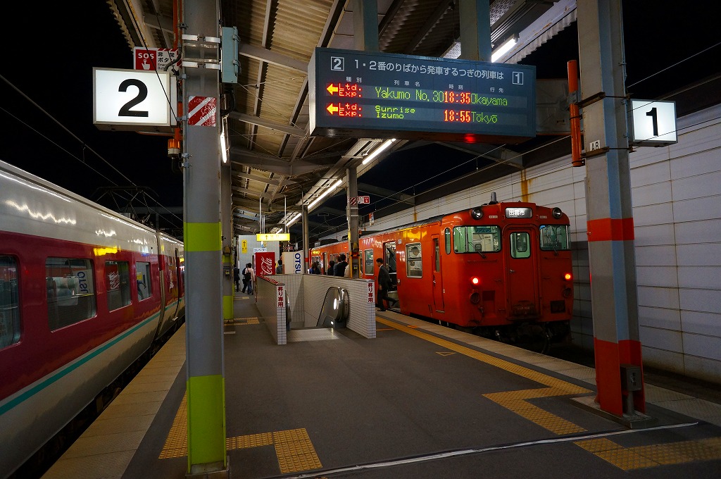 出雲市では2000(平成12)年に高架化工事が完成、その後は駅前にビジネスホテルが何棟も進出し、道路も広く整備され、お隣の一畑電車の電鉄出雲市駅も後退のうえ高架化され、景色が一変した。夜が早い町で18時にもなれば開いている店がほとんどない状況は、20年経っても変わらない感じ。