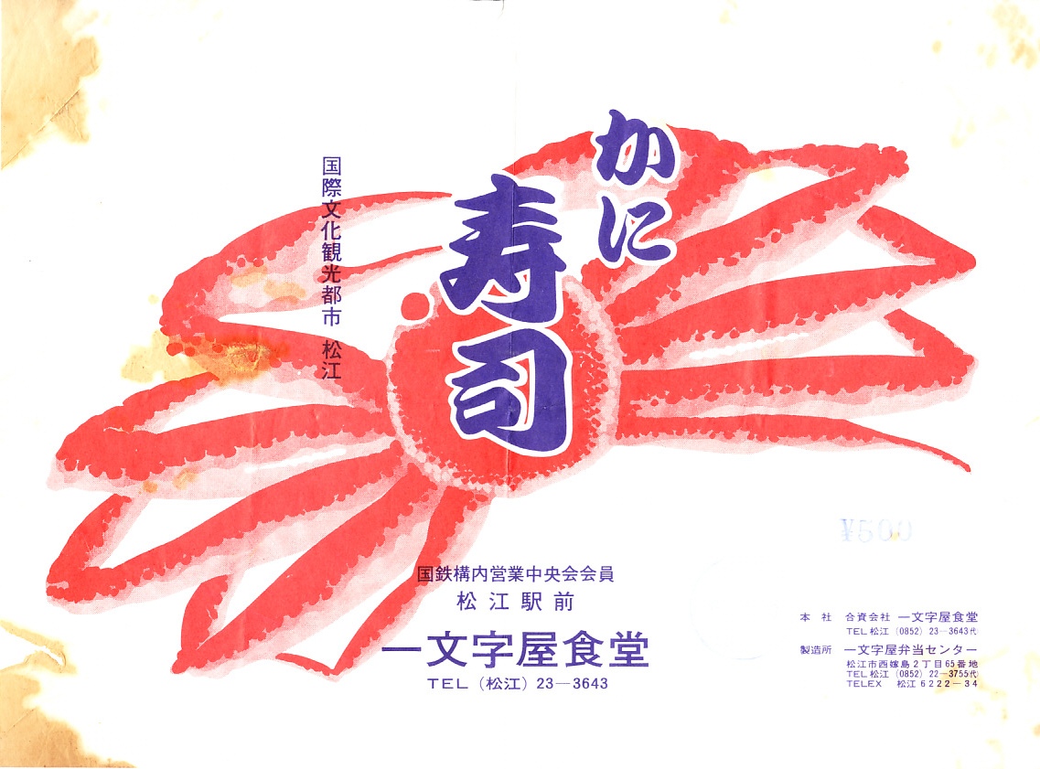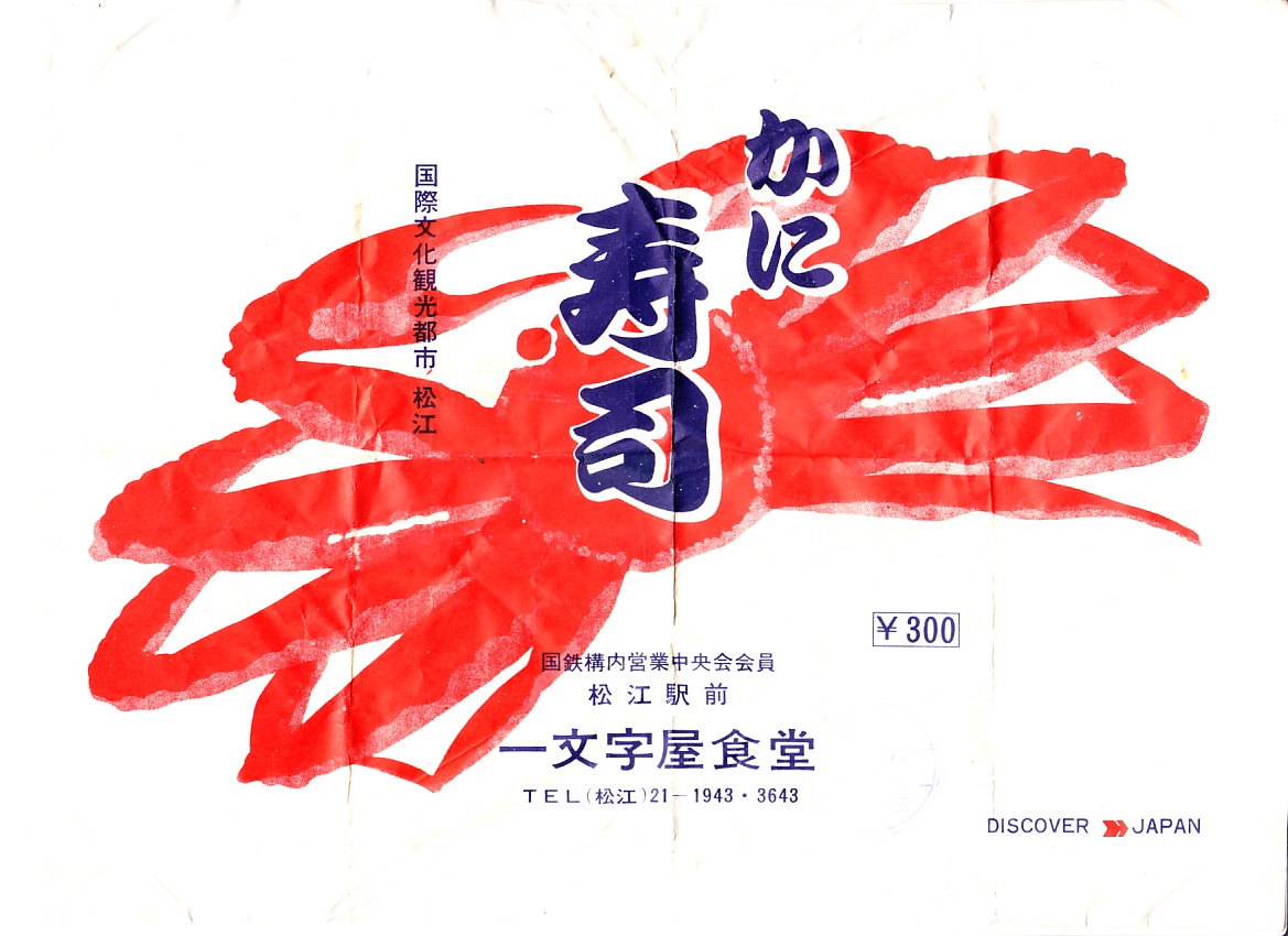 1970年代の調製と思われる、昔の松江駅弁の掛紙。300円の価格から、1972年頃のものか。商品名と調製元と赤いカニのみを描いた、分かりやすい絵柄。掛紙に記される「国際観光文化都市」とは、自称やキャッチフレーズではなく、1951年に公布された松江国際文化観光都市建設法に基づく法律用語であり、この名では全国で京都市と奈良市と松江市のみが使える。