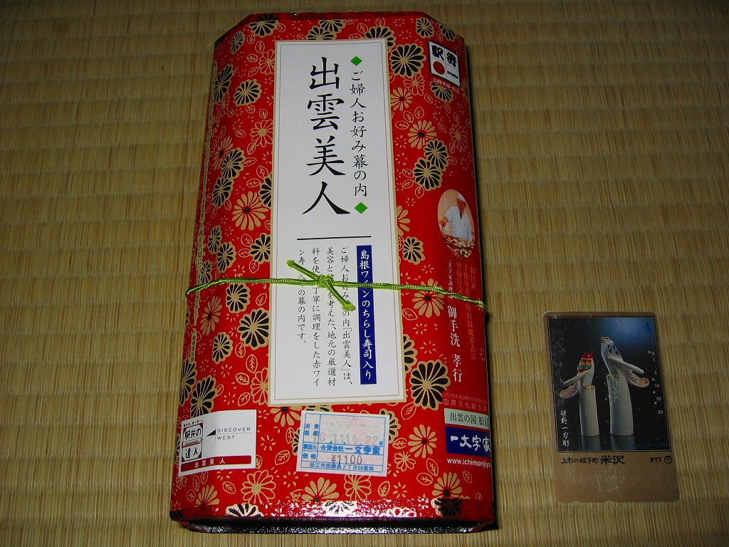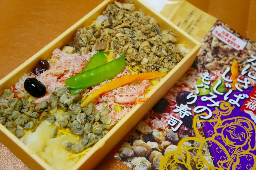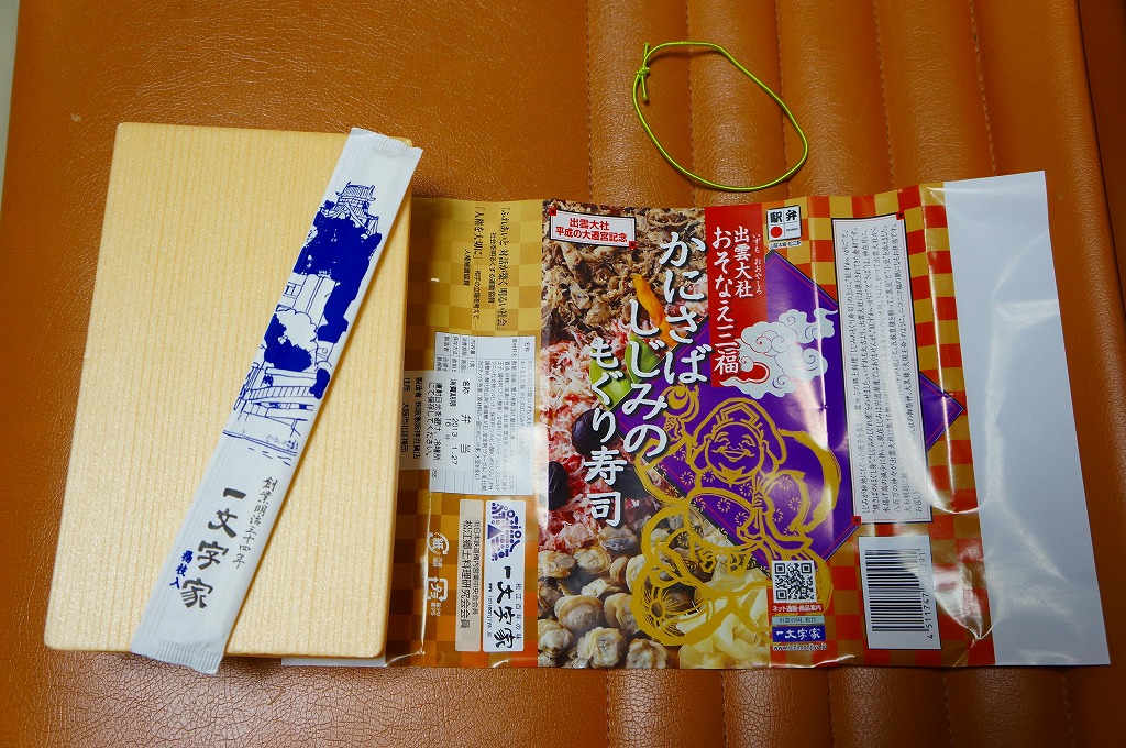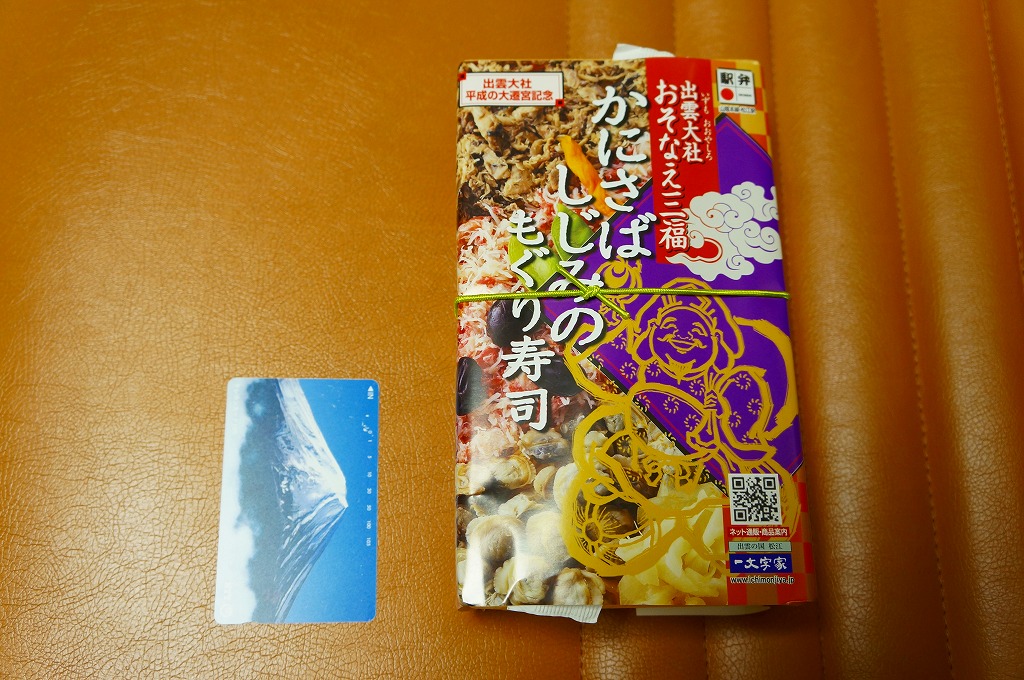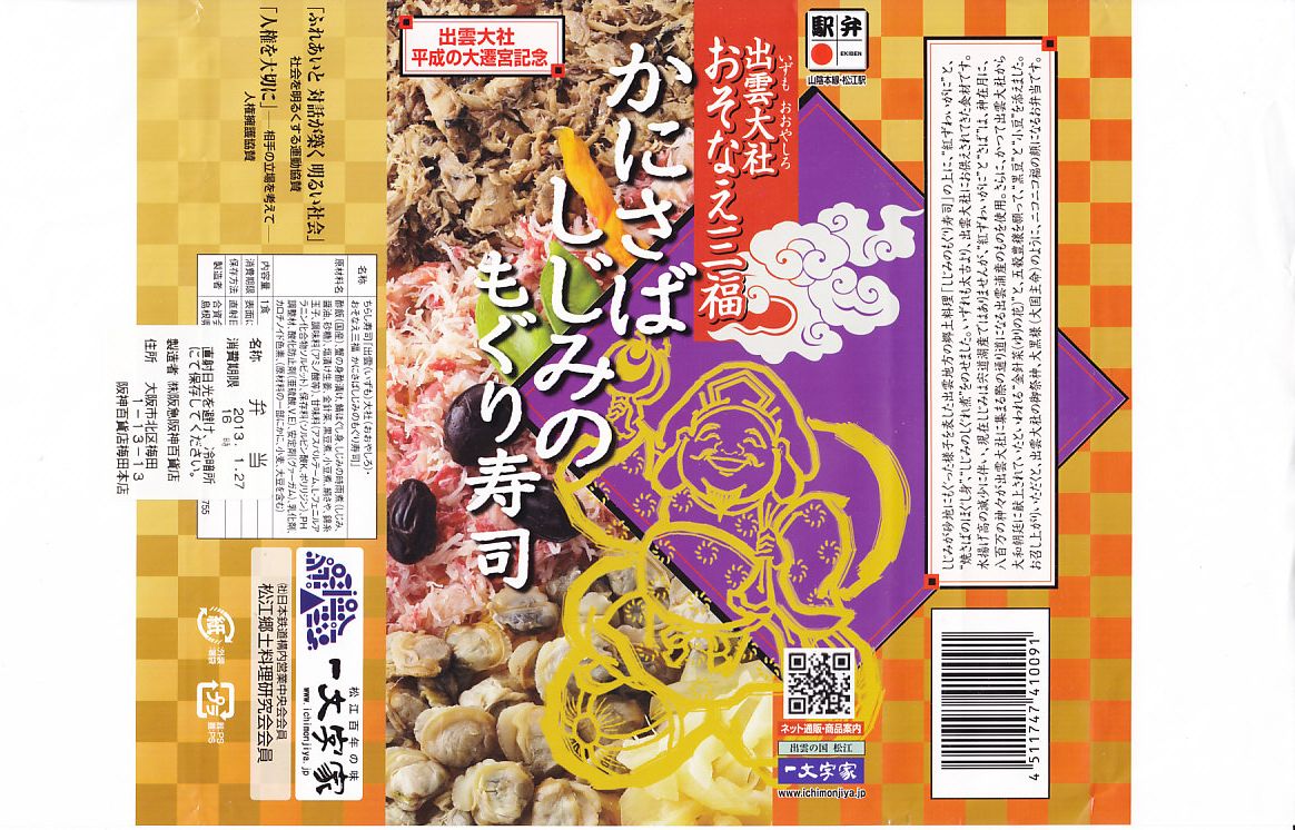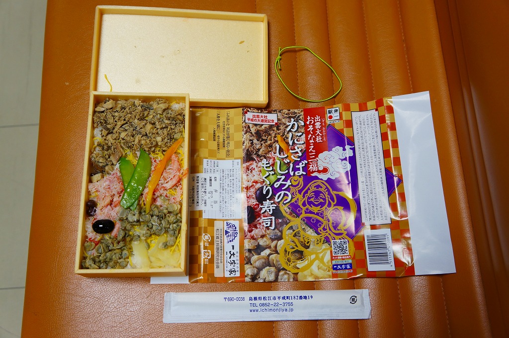 出雲大社の遷宮を記念して、2013(平成25)年1月の阪神百貨店の駅弁大会でデビューか。長方形の容器に酢飯を敷き、サバほぐし身、カニ酢漬けのほぐし身、シジミの時雨煮で覆い、生姜や黒豆やインゲンなどを添えるもの。駅弁として悪くない味だが、見た目の個性と見栄えのツヤがないため、満員の客で賑わう大都会の百貨店の催事場ではとても地味であり、実演販売ブースではずっと客待ちをしていた。価格は2013年の発売時や購入時で1,050円、2016年時点で1,060円。2018年頃か2020年までの販売か。