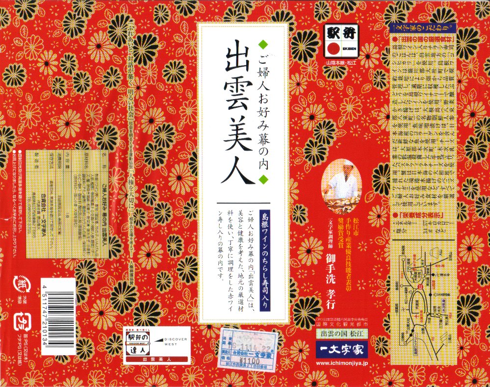 戦前戦中の駅弁には掛紙に各種の標語が記されているものが多いが最近はまず見かけない。この駅弁には側面で目立たないが「ふれあいと 対話が築く 明るい社会」「人権を大切に」と印字される。底面には島根・広島・山口の交通地図を掲載し、一方で駅弁そのものの宣伝や情報は冬期の地方発送案内だけという不思議なもの。あるいは、公的活動という観点から調製元の地元経済界での地位の高さを示すものか。価格は2004年の購入時で1,000円、2010年時点で1,100円、2014年時点で1,150円、2016年時点で1,170円、2018年時点で1,200円、2019年時点で1,250円、2020年時点で1,370円、2023年時点で1,550円、2024年時点で1,700円。