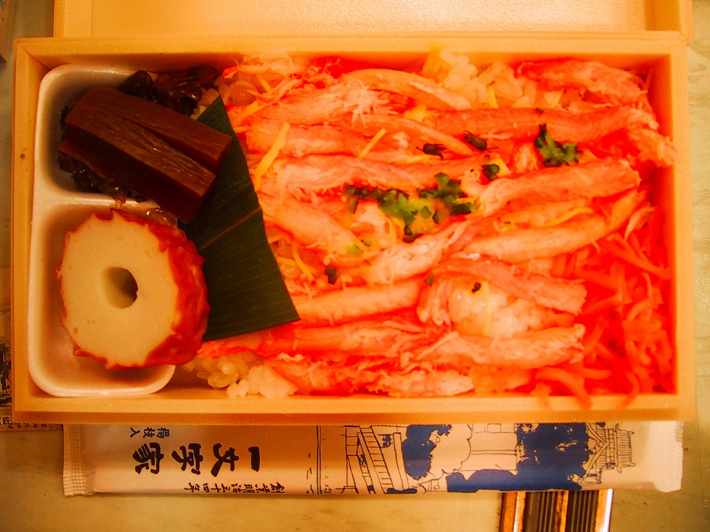 秋冬の駅弁大会シーズンに向けた、2007(平成19)年秋の新商品で、10月1日に発売。赤く小柄でフタがしっかり閉まる構造の容器を、やはりそれがぴったりと収まるボール紙の枠にはめる。その絵柄はカニで真っ赤っか。中身は赤貝入りの茶飯の上をカニのほぐし身と細めの脚肉で覆い隠して、やはり真っ赤っか。サツマイモ、こんにゃく、酢の物を添えてできあがり。食べて飯の内外に現れる赤貝の、カニと飯とのハーモニーはクセになる。2008年1月の京王百貨店の駅弁大会では入手困難の人気だったそうな。