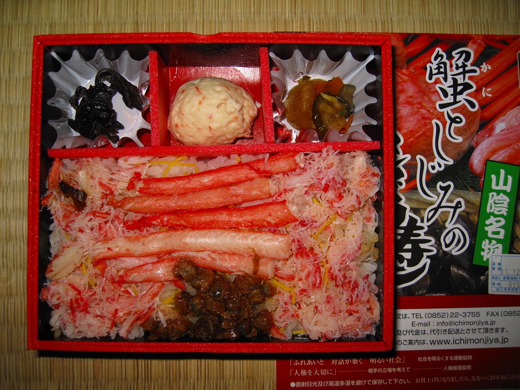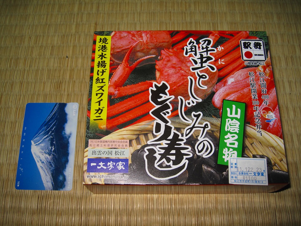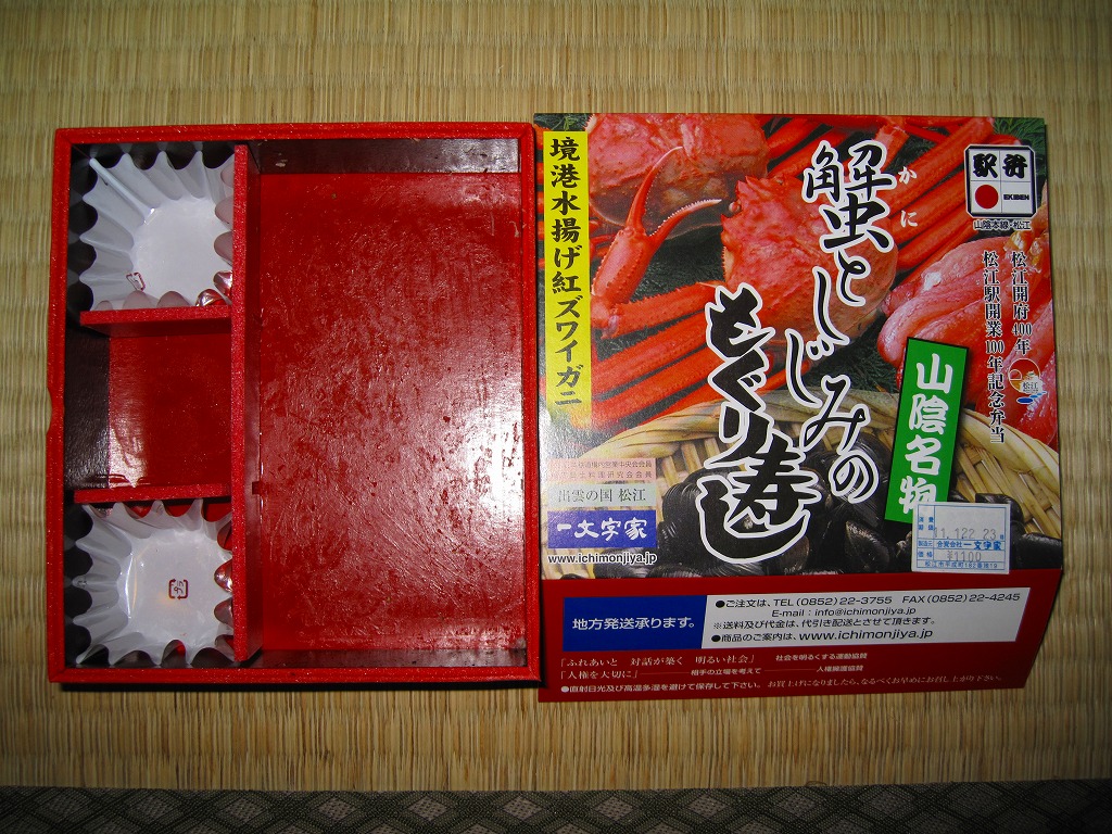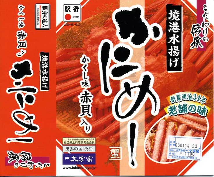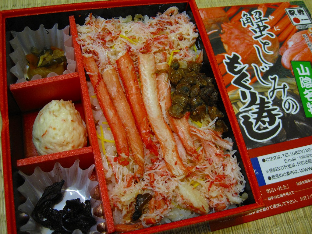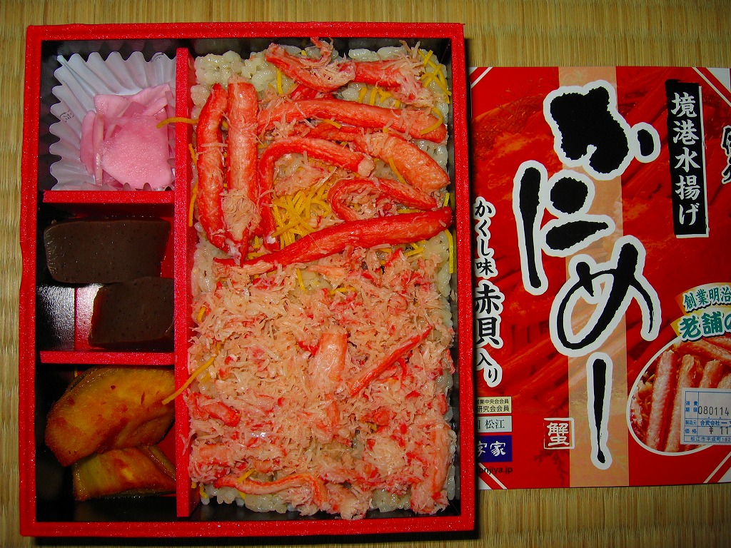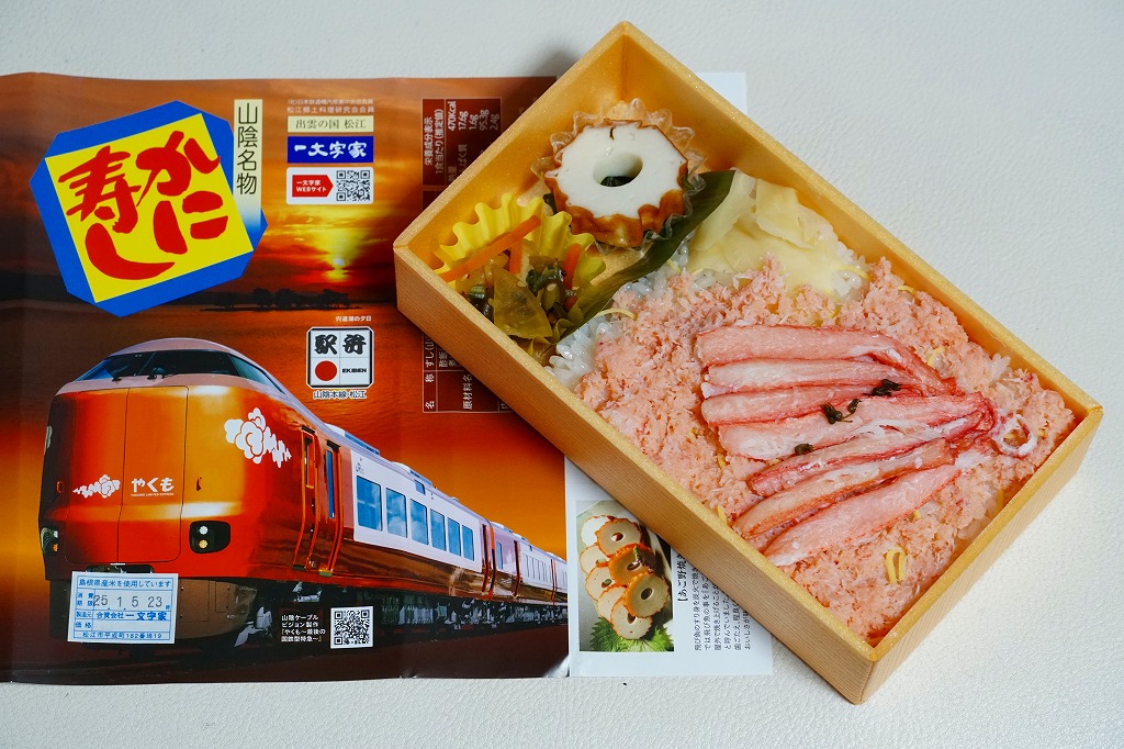 松江駅のカニ寿司駅弁。甘酢御飯の上にカニの足が、細身ながら10本前後敷かれる。カニ寿司駅弁は、特に駅弁大会向けに遠隔地へ輸送する場合、酢漬けにされてしまうことが多いが、この駅弁は東京都内の駅弁大会で購入したにもかかわらず飯やカニの味を感じられた。価格は2003年の購入時で950円、2008年7月22日から1,050円、2014年4月の消費税率改定で1,080円、2016年時点で1,100円、2018年時点で1,150円、2019年時点で1,200円、2020年時点で1,320円、2023年時点で1,500円、2024年時点で1,630円。