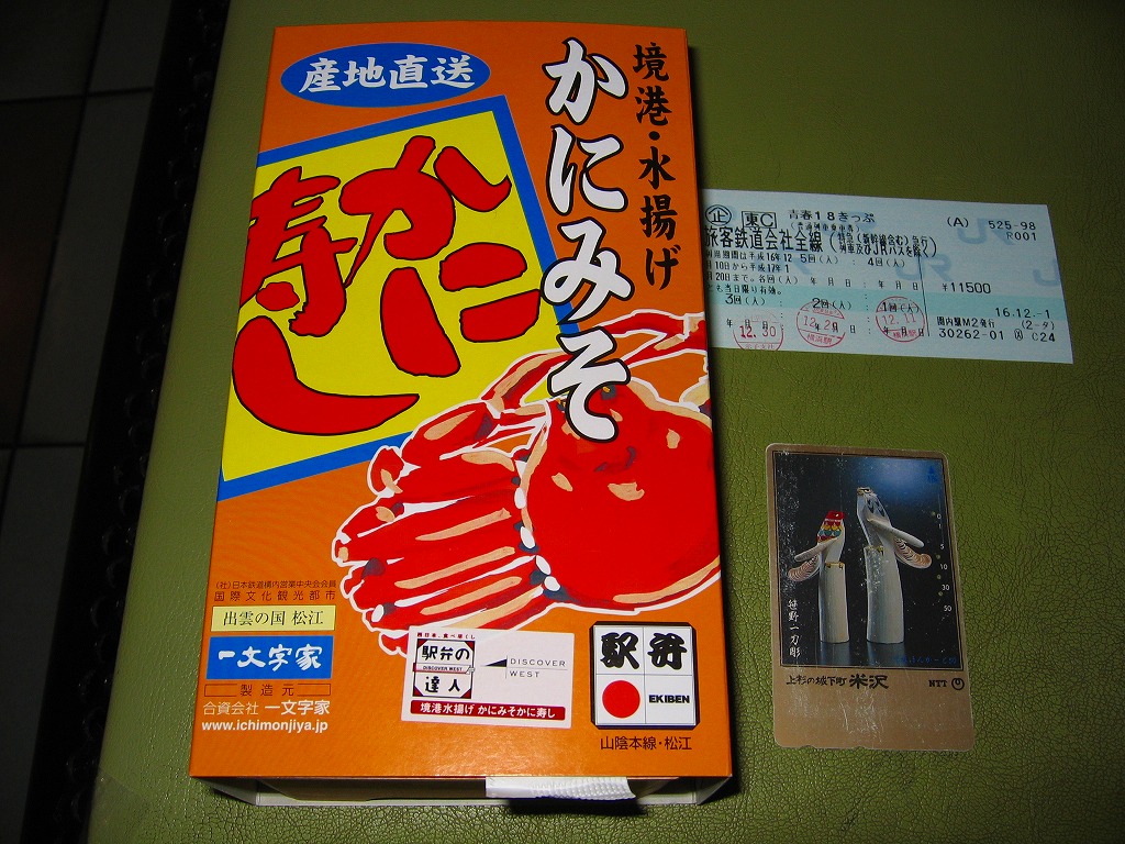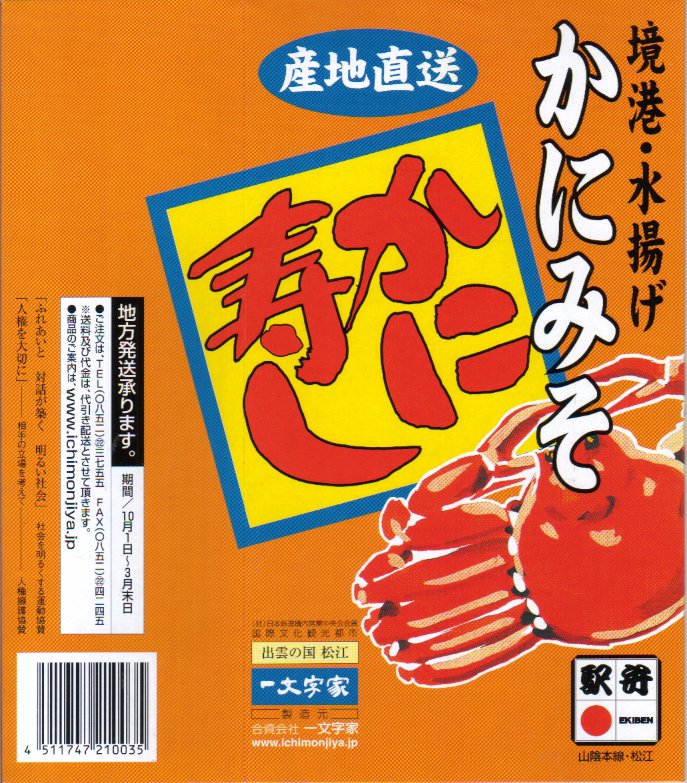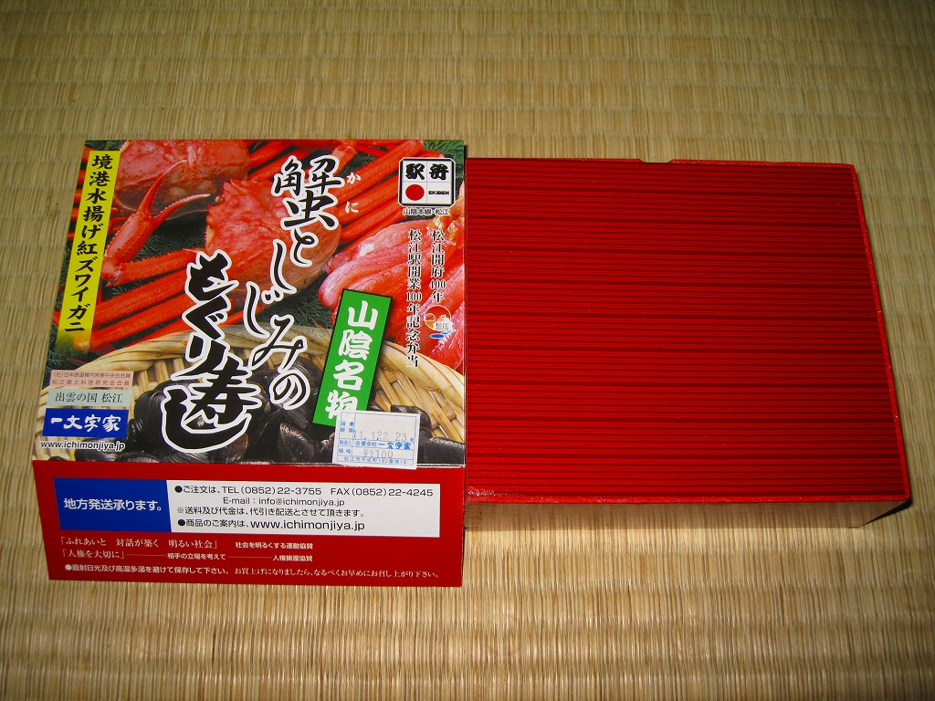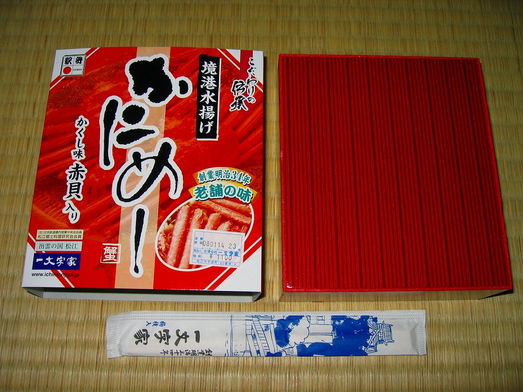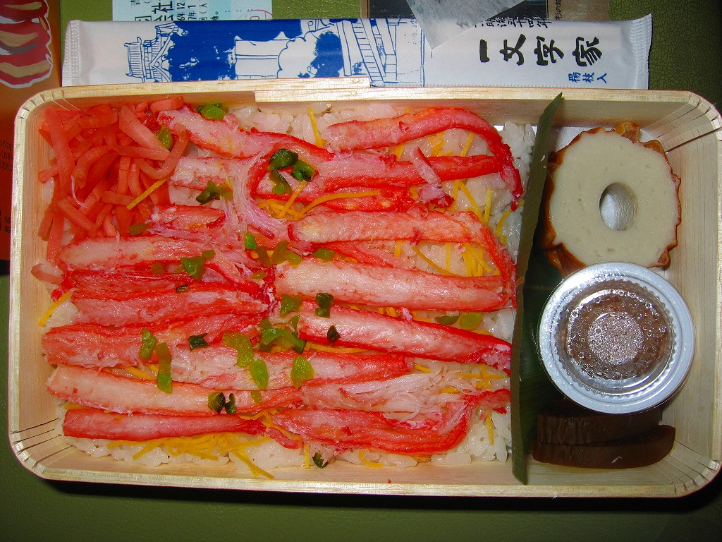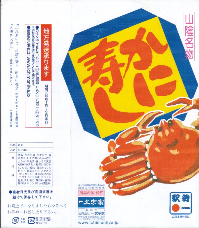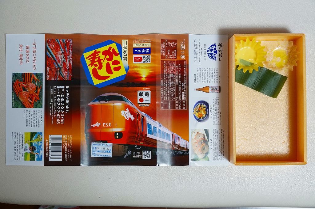 松江駅のカニ寿司駅弁。甘酢御飯の上にカニの足が、細身ながら10本前後敷かれる。カニ寿司駅弁は、特に駅弁大会向けに遠隔地へ輸送する場合、酢漬けにされてしまうことが多いが、この駅弁は東京都内の駅弁大会で購入したにもかかわらず飯やカニの味を感じられた。価格は2003年の購入時で950円、2008年7月22日から1,050円、2014年4月の消費税率改定で1,080円、2016年時点で1,100円、2018年時点で1,150円、2019年時点で1,200円、2020年時点で1,320円、2023年時点で1,500円、2024年時点で1,630円。
