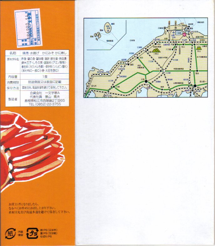 1976(昭和51)年6月29日の調製と思われる、昔の松江駅弁の掛紙。絵柄は下記の1970年代のものと同じく、立派なズワイガニが真っ赤に描かれていて分かりやすい。調製元の電話番号が異なる。