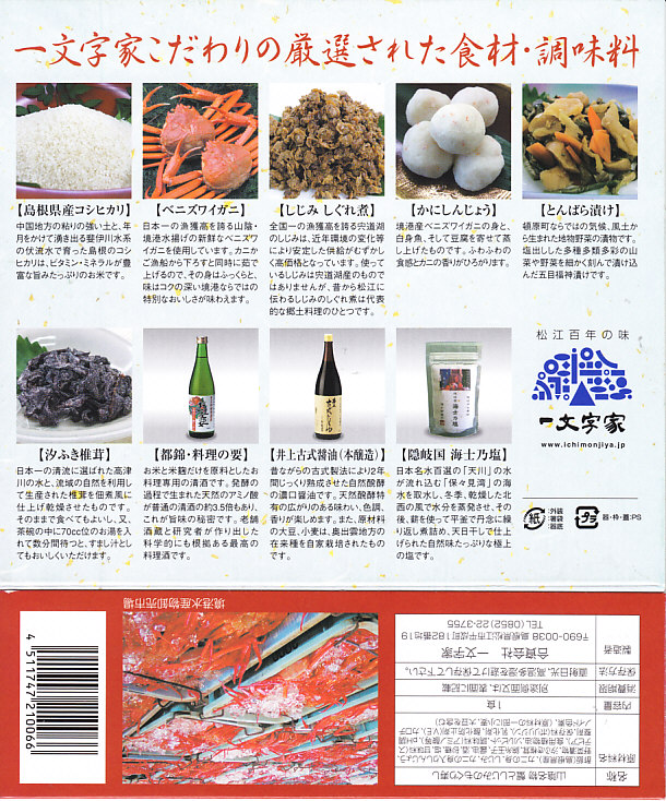 長方形の容器に、島根県産コシヒカリの酢飯を詰め、錦糸卵とカニそぼろで覆い、ベニズワイガニの棒身の酢漬けを並べ、しその実で彩り、ちくわ「あご野焼き」、とんばら漬け、わかめ佃煮、酢生姜を添える。掛紙には写真付きで食材の紹介があって分かりやすい。値段を気にしなければ、地元の名物も知られざる味も楽しめる、お食事向けに機能的なカニ駅弁だと思う。