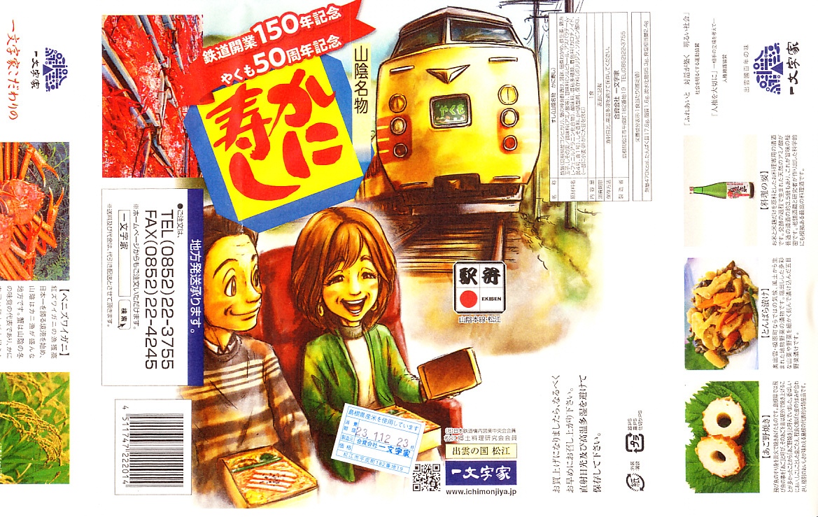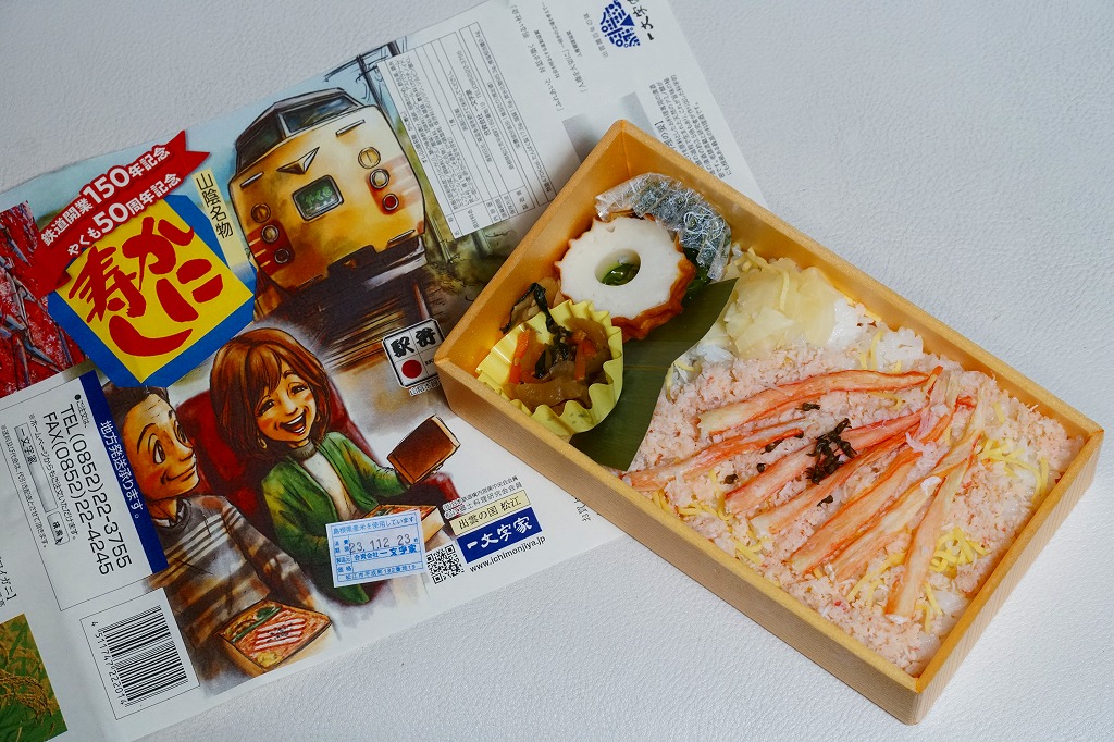 2022(令和4)年10月14日に松江駅で発売、3月31日まで販売の予定。日本鉄道構内営業中央会の鉄道開業150年記念復刻駅弁企画により、同月から期間限定で販売された31社34駅弁のひとつ。ここではさらに、特急やくも開通50周年も記念して、既存の駅弁「山陰名物かに寿し」をリニューアルした。レトロ調の水彩画タッチとされる掛紙には、特急やくもと車内と駅弁のイラストを描く。
