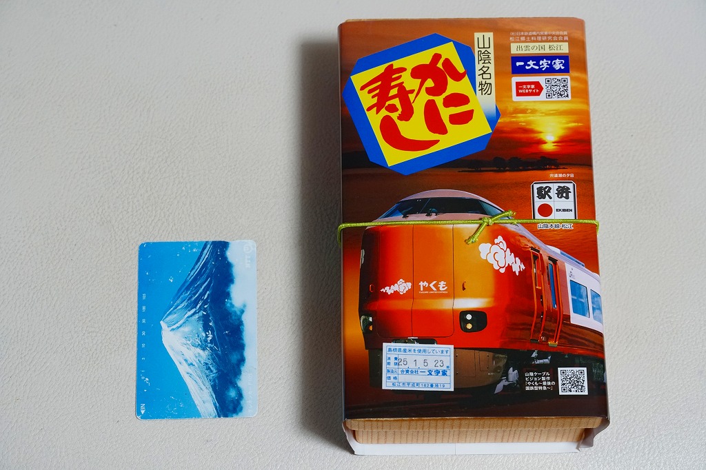 2024(令和6)年5月に松江駅などで発売。上記の駅弁「山陰名物かに寿し」について、 特急やくも号の新型車両登場を記念して、スリーブをそのCGイラストを用いた掛紙に替えて発売した。中身と価格は通常版と同じ。公式サイト上では通常版とこの版を併売しているように見えるが、この掛紙を使う間は通常版を売らないのではと思う。