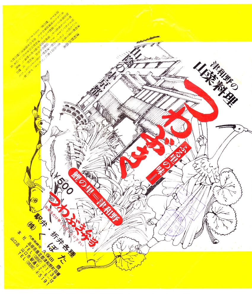 入手状況から1978(昭和53)年のものと思われる、昔の津和野駅弁の掛紙。絵柄は当時も21世紀の今も変わらないものの、掛紙から読み取れる駅弁の名前は「山菜弁当」でなく「つわぶき」だった。