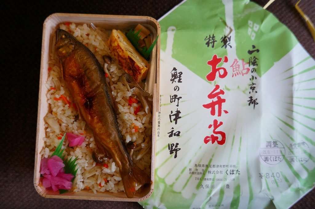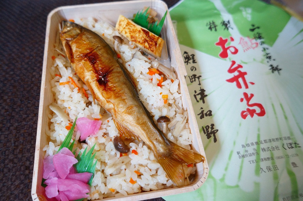 津和野駅でSL列車の運転日にのみ販売した、知られざる駅弁。長方形の経木枠の容器を、幕の内駅弁の掛紙に「鮎」の朱印を押した厚手の掛紙で包む。中身はニンジンやシメジなどの五目飯の上に焼アユがまるごと1本載り、玉子焼や大根桜漬などを添えるもの。アユの少々の骨っぽさも含め、見栄えも風味も素朴の塊。価格は2011年の購入時で840円、2015年時点で870円、2020年時点で900円を経て950円、2023年時点で1,000円。駅のうどん店が2021年5月限りで閉店し、駅弁も終売となったが、調製元では予約により買えるほか、ほどなく観光列車の発着に合わせて津和野駅でも売られるようになった。