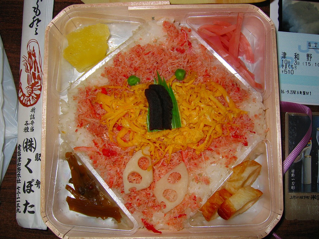 中身は山陰地方の他のカニ寿司駅弁と同じく、酢飯の上にカニほぐし身が敷き詰められるもの。味にパンチ力はないが、カニの風味をほのかに感じられる。価格は2004年の購入時で840円、2015年時点で870円。もう販売されていないと思われる。