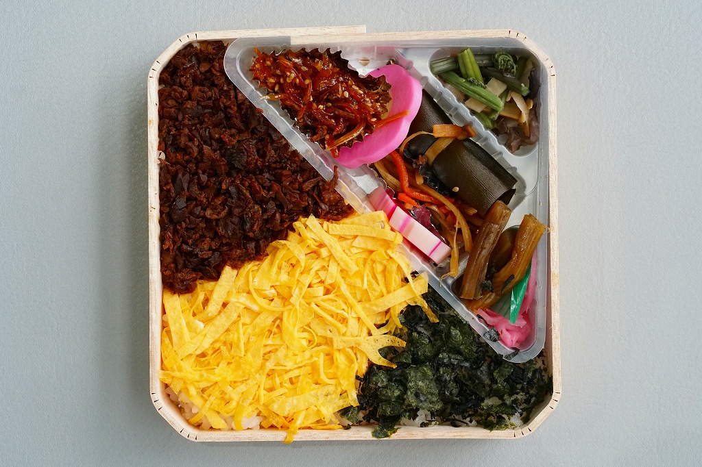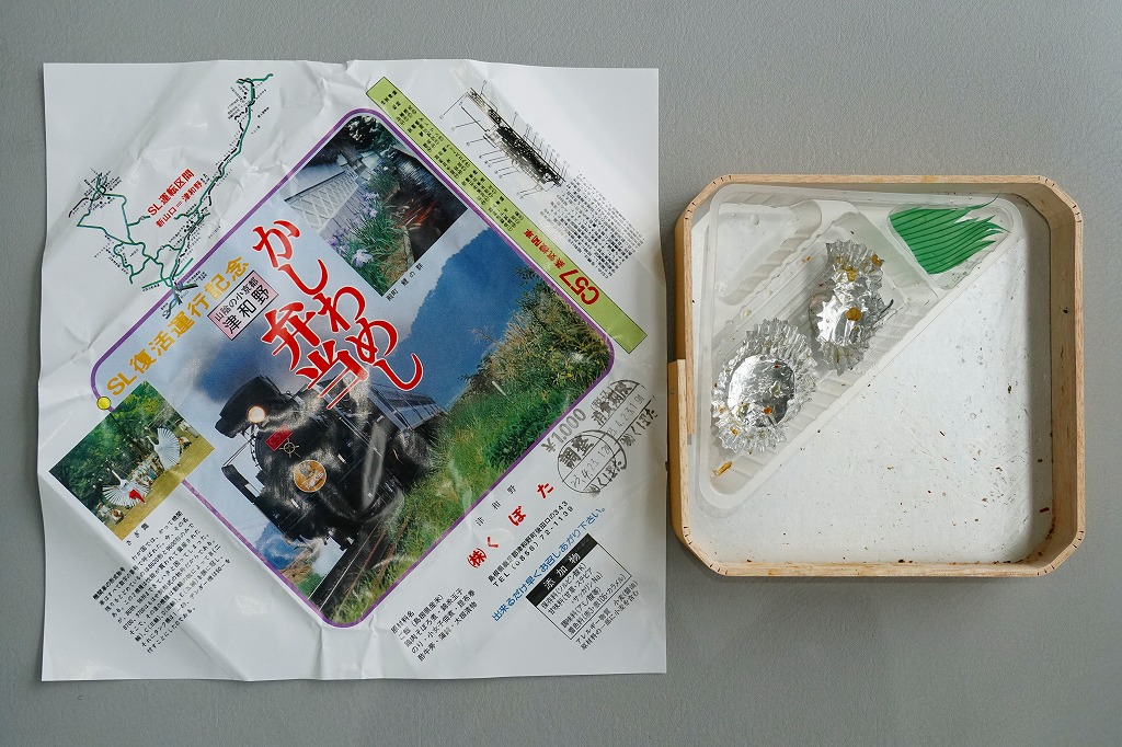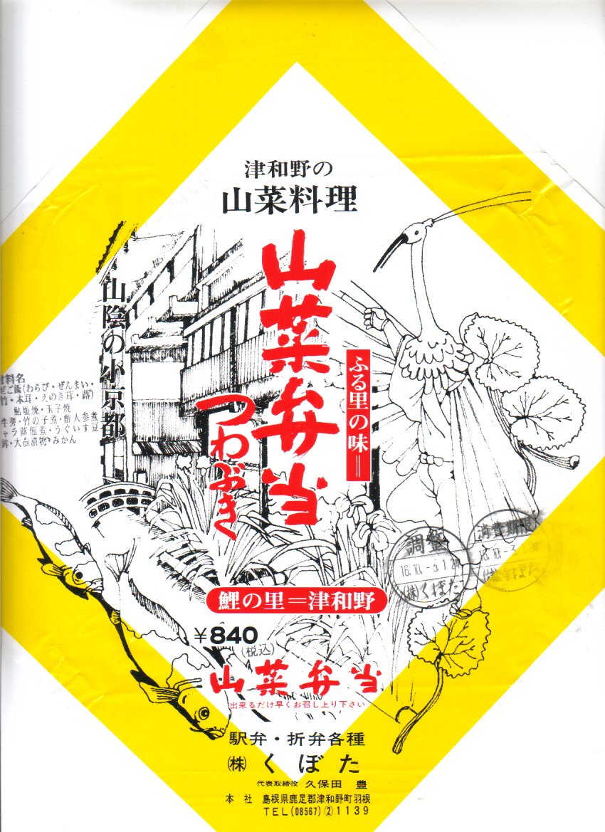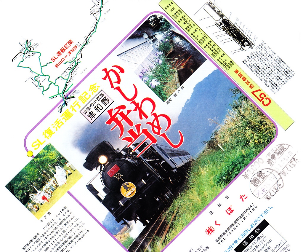 1960年代の発売か。他の津和野駅弁と同じく、経木枠の正方形の容器に経木のふたをして、正方形の掛紙をかけてビニールひもでしばる。その掛紙には「SL復活運行記念」の文字があり、マニアックに見ると蒸気機関車や客車の外観が現在と異なる運行開始時のスタイルなので、おそらく1979(昭和54)年8月当時の絵柄がそのまま使われていたのだろう。