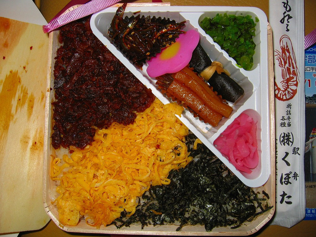津和野駅の幕の内弁当。他の津和野駅弁と同じく、経木枠の正方形の容器に経木のふたをして、正方形の掛紙をかけてビニールひもでしばる。掛紙の背景は毎年7月下旬に津和野市街で開催される鷺舞(さぎまい)の風景で、その由来が掛紙に記される。中身は日の丸御飯にメンチカツや玉子焼やエビフライや焼鱒など。価格に見合うような高級感はないが、手作り感はたっぷりあり、その線で味はよい。