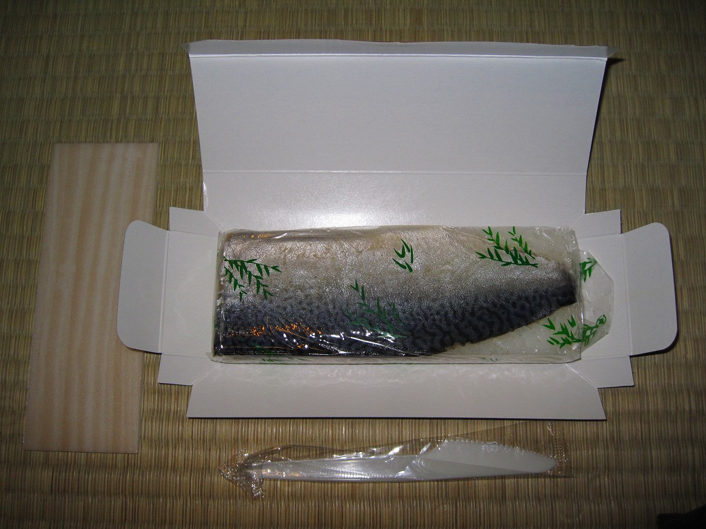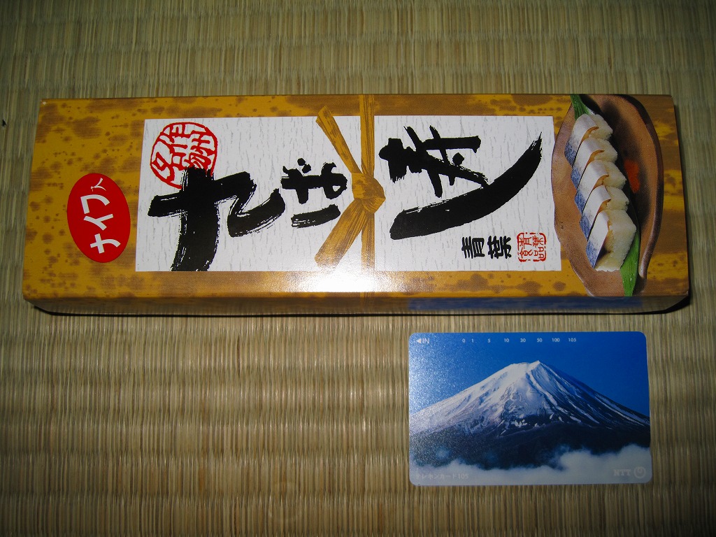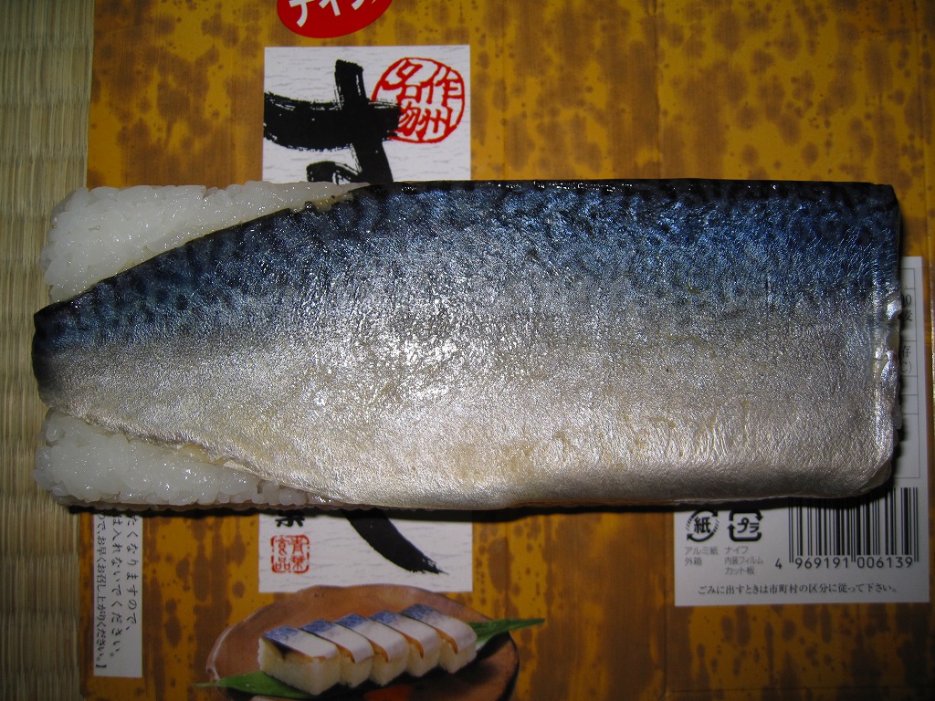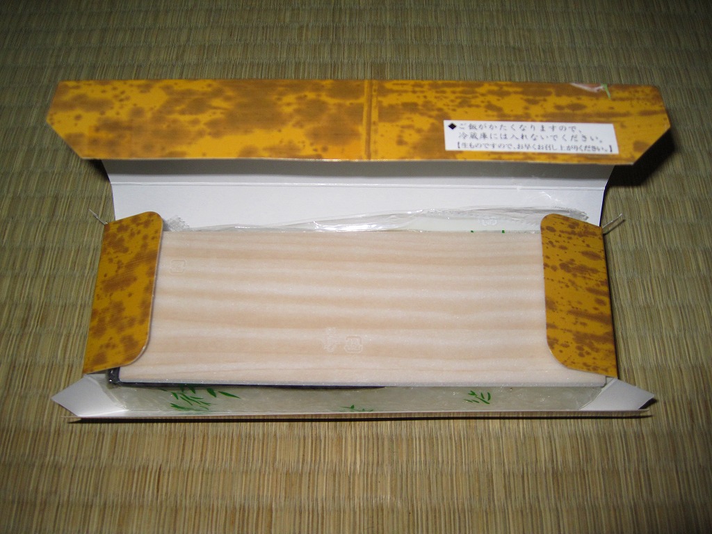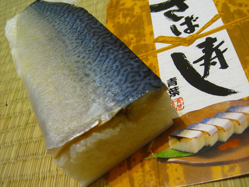 高速道路のサービスエリアで買えたサバ棒寿司。2003年の空弁ブーム以降は焼サバ寿司に押されがちな、焼かない酢締めのサバをコシヒカリの酢飯に合わせた棒寿司が、カットされずに密封されずに1本、竹皮を模したボール紙の箱に収まる。通信販売対応商品。