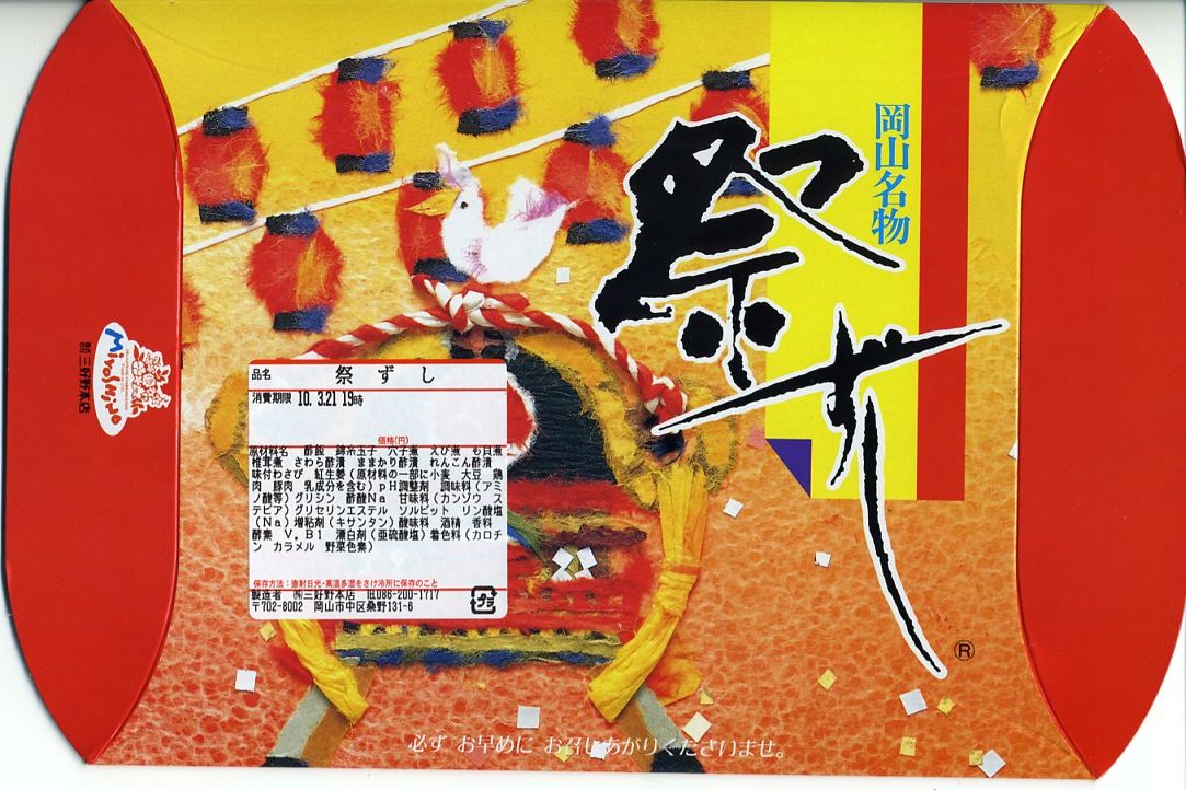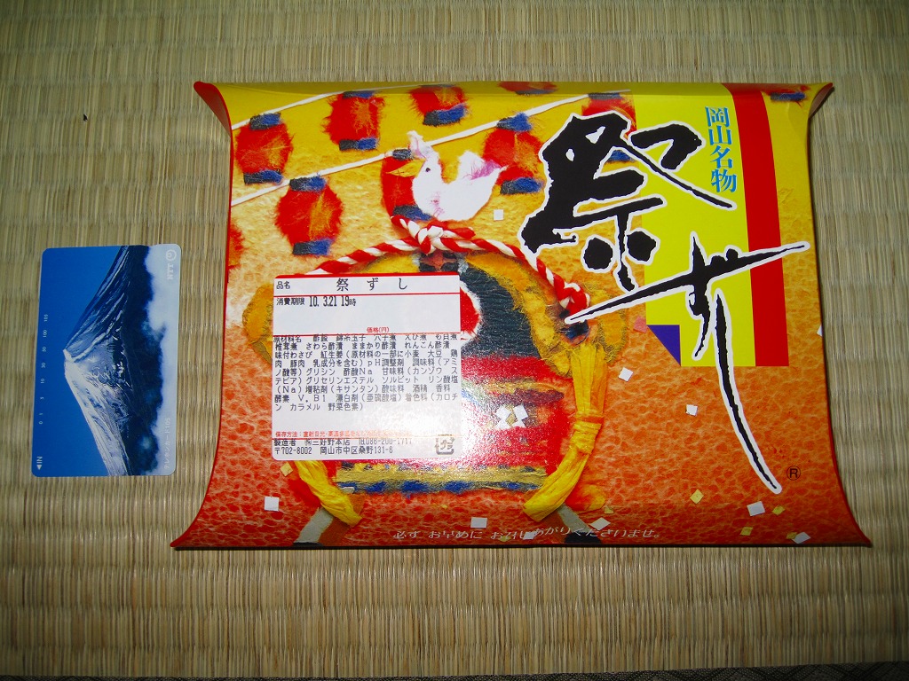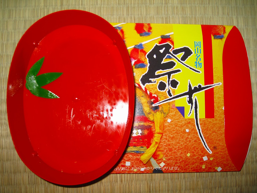 岡山の名物駅弁「祭ずし」と同じ名前と内容と風味なのは、製造者が岡山の駅弁屋であるから。しかし、駅でも高速道路でもドライブインでも同じ弁当を売る駅弁屋が多い中で、ここでは駅弁とまるで異なるパッケージと容器を使っていることが興味深い。お値段も駅弁より控えめ。