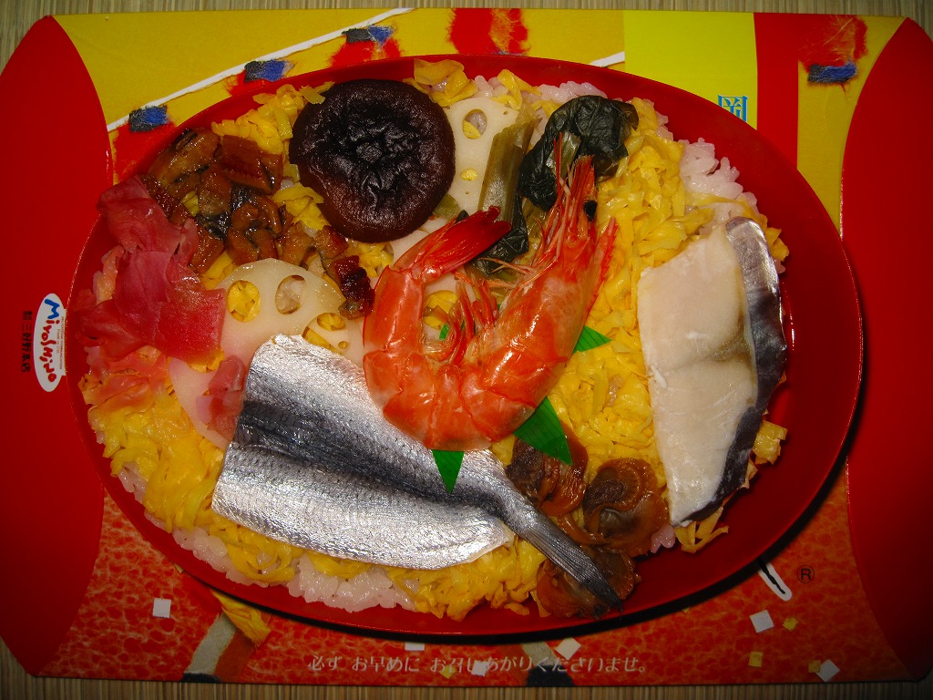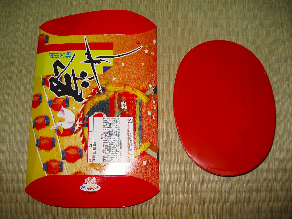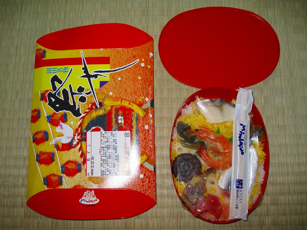 高速道路のサービスエリアで買えたお弁当。楕円形の赤いプラ容器を、お祭りのちょうちんとおみこしを描いたボール紙のパッケージに収める。中身は酢飯の上を錦糸卵で覆い、有頭海老、ママカリ、有頭海老、サワラ、アナゴ、しいたけ、レンコンなどで覆うもの。