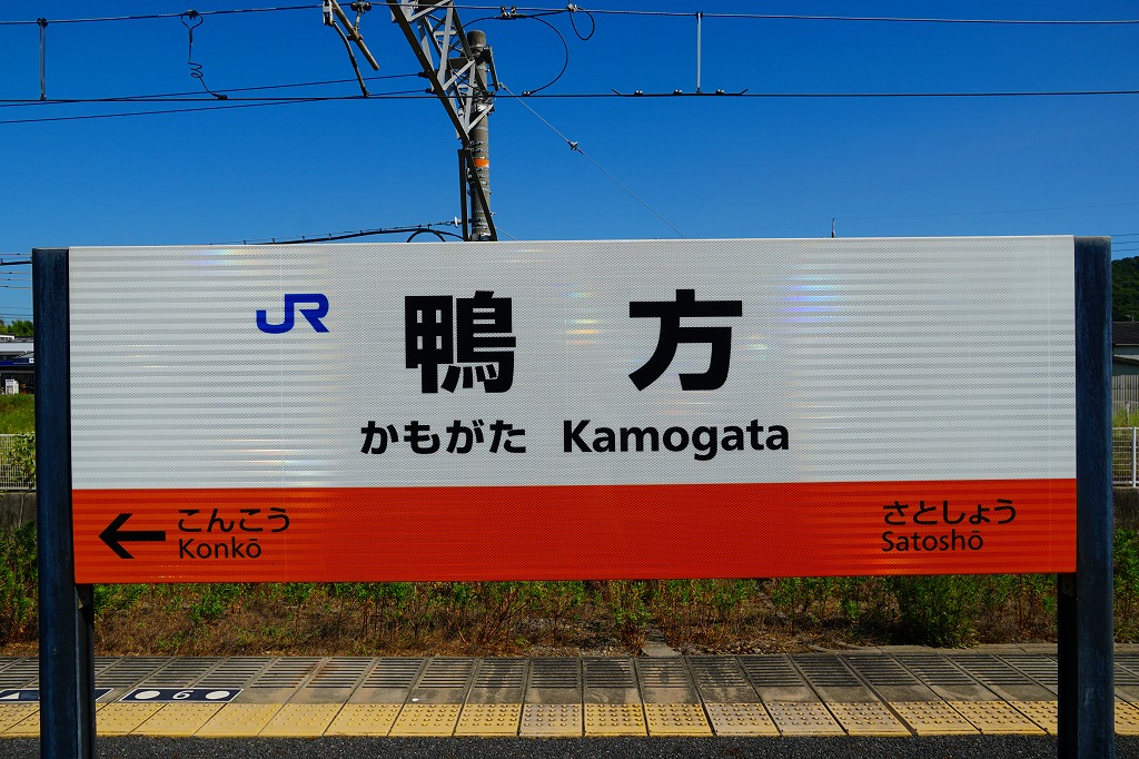 岡山駅から山陽本線の電車で約35分。浅口市(あさくちし)は岡山県の南東部で2006年に3町が合併してできた、人口約3万人の市。鴨方には江戸時代に岡山藩の支藩の陣屋が置かれて何本もの往来(街道)が集まり、明治時代に半里ほど南にできた鉄道駅の駅名となった。鴨方駅に駅弁はないが、戦前昭和時代には構内営業者がいたという。1891(明治24)年7月14日開業、岡山県浅口市鴨方町六条院中。