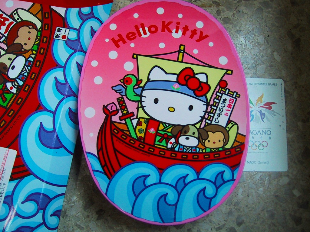 パッケージと容器はキティちゃんでいっぱい、付属のフォークもキティちゃんで、蒲鉾にも顔が入る。2002年3月に上記の駅弁「はろうきてぃのまつりずし」へリニューアル。