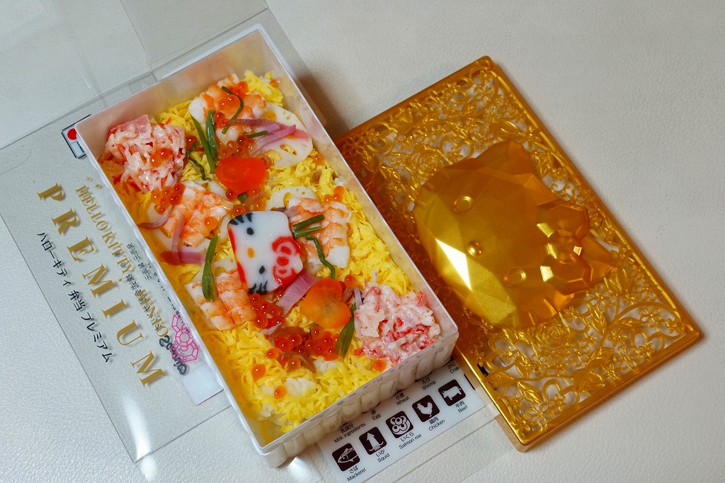 2019(令和元)年9月1日または5日の発売。プラ製ながら金銀の宝石箱を思わせる容器に、サンリオのキャラクター「ハローキティ」の顔が浮き出る。中身は酢飯を錦糸卵で覆い、エビ、カニかま、イクラ、レンコンなどを散らす、ちらし寿司ないし祭ずし。見た目の華やかさをプレミアムとするようで、ハローキティの45周年を記念した商品だそうな。2022年で終売か。