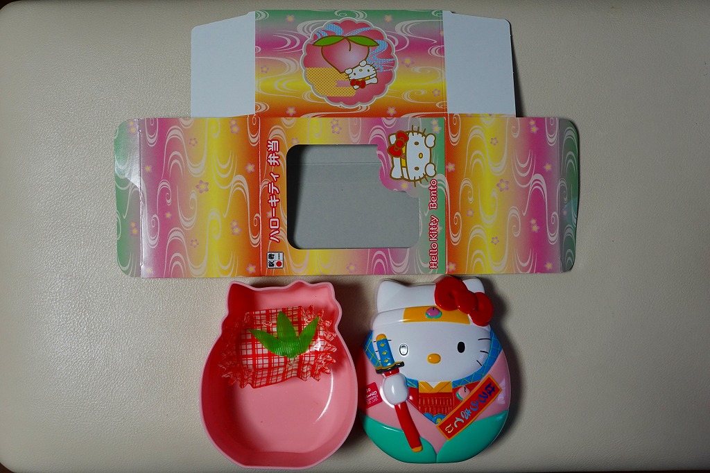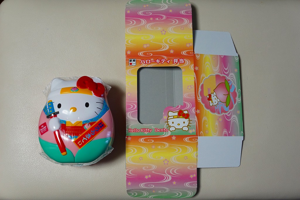 岡山の駅弁屋に研修というか武者修行に来ていた高崎と小田原の駅弁屋が、キャラクター駅弁のアイデアを地元に持ち帰ってキティちゃん駅弁を発売、その立体成型容器がうまくできていたことから、これを岡山の駅弁屋が逆導入したのだとか。2004年5月1日に上記の駅弁「お祭りハローキティ」へリニューアル。