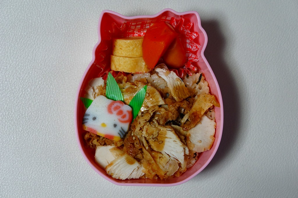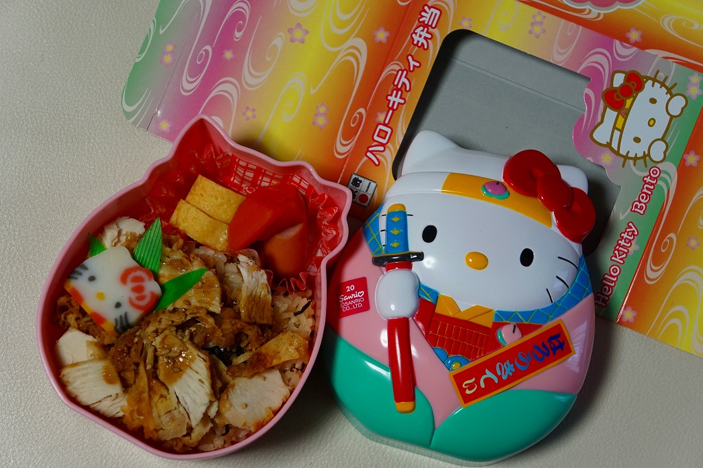 中身は茶飯を鶏唐揚で覆い、ニンジン、ウインナー、玉子焼、キティ顔のかまぼこを添える。スライスされた鶏唐揚は、まるで油の薄いツナのような味。子供向けでないような内容が興味深い。2018年12月限りで終売。