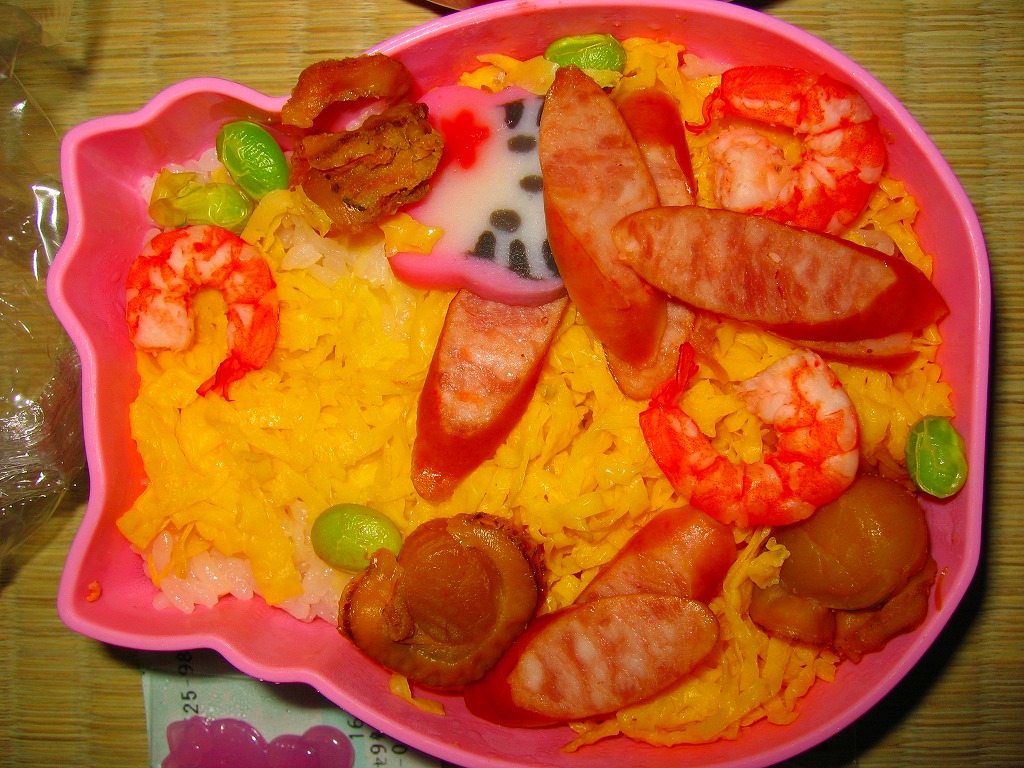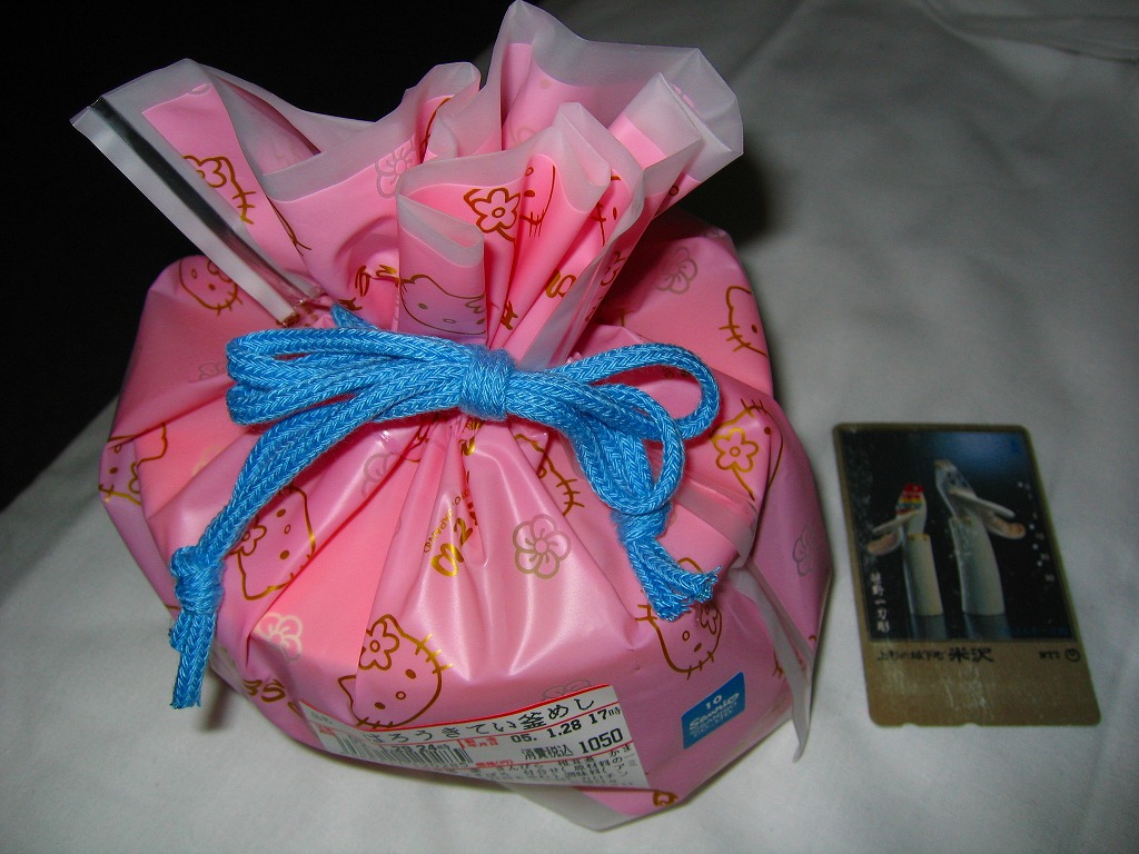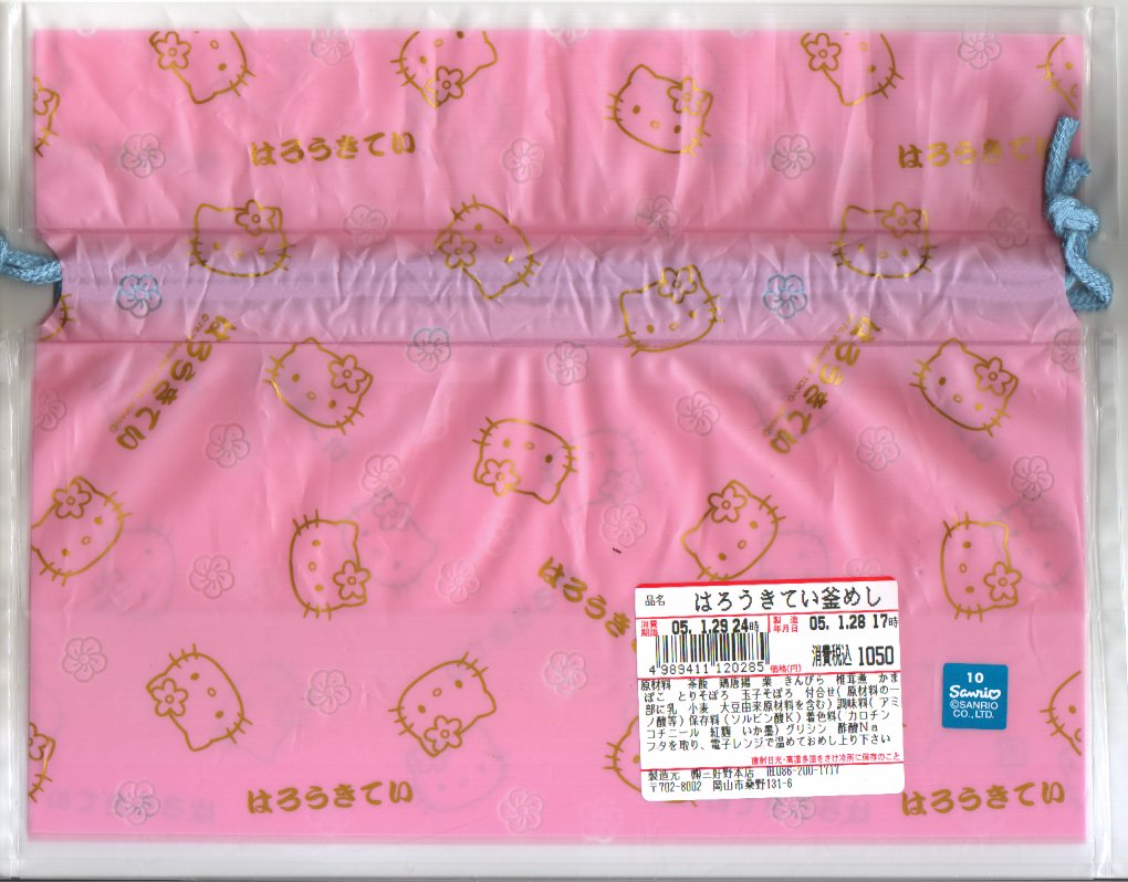 岡山駅のキティちゃん駅弁の第二弾として、1999(平成11)年11月1日に発売。ピンク色の陶製釜飯容器にキティ顔の陶製蓋を載せ、桃赤水黄緑と五色のバージョンがあるというキティ顔のプラ製フォークを付けて、キティ柄なピンク色のビニール製きんちゃく袋に入れる。