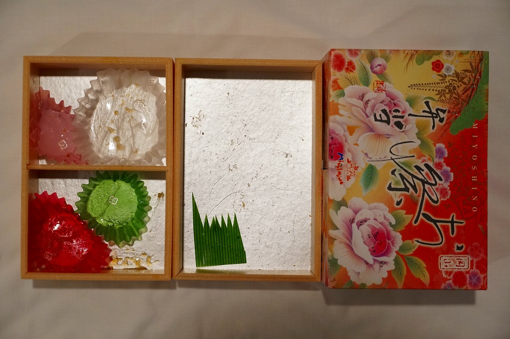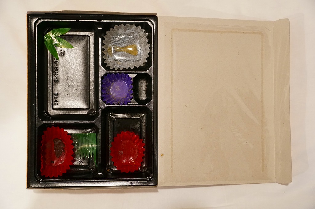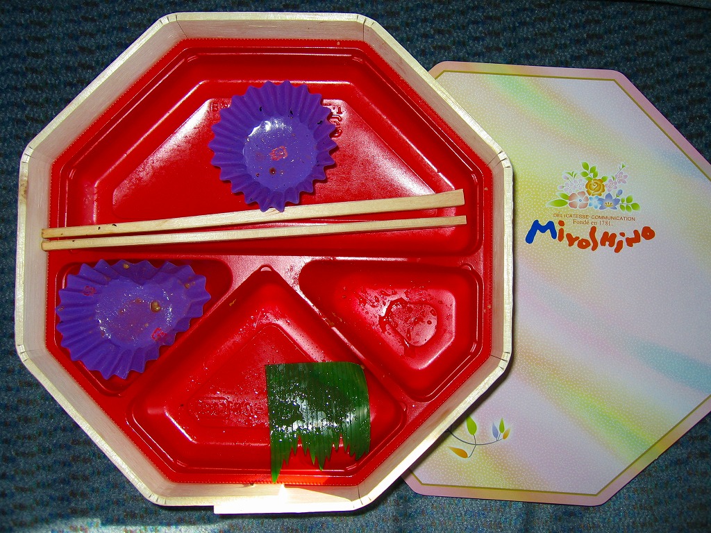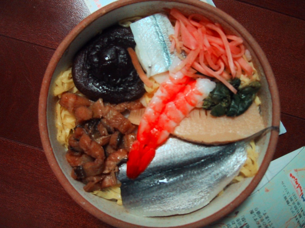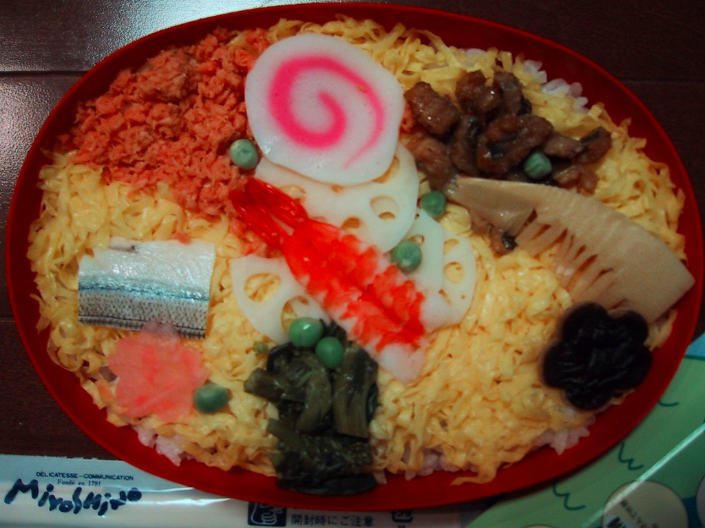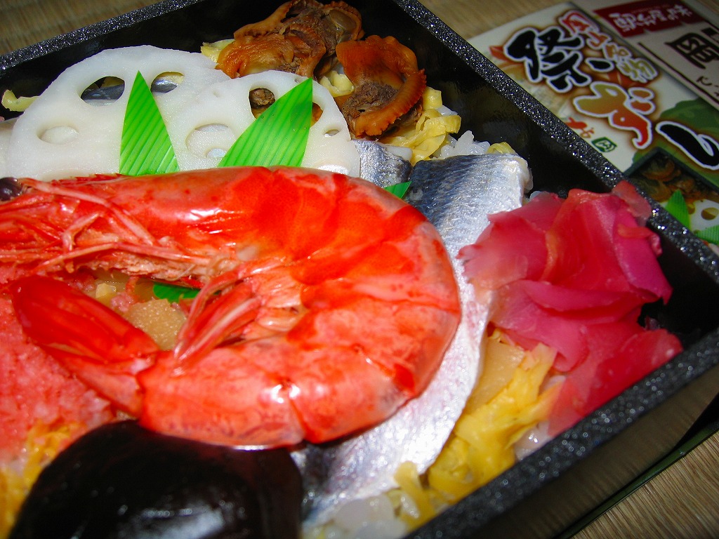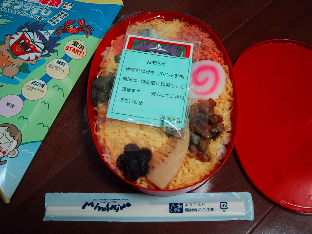 約11センチ四方の容器の中に甘めの酢飯を詰めて錦糸卵を敷き、ママカリ酢漬、サワラ酢漬、椎茸、蓮根、有頭海老などを貼り付ける。内容は岡山駅弁らしいし、風味も岡山駅弁のもの。具の密度が濃い分だけ、岡山駅弁の通常版より感覚的な豪華さは上だろう。現地にミニ祭ずしの需要があれば、併売されてもよいと思う。1シーズンで消えたらしい。