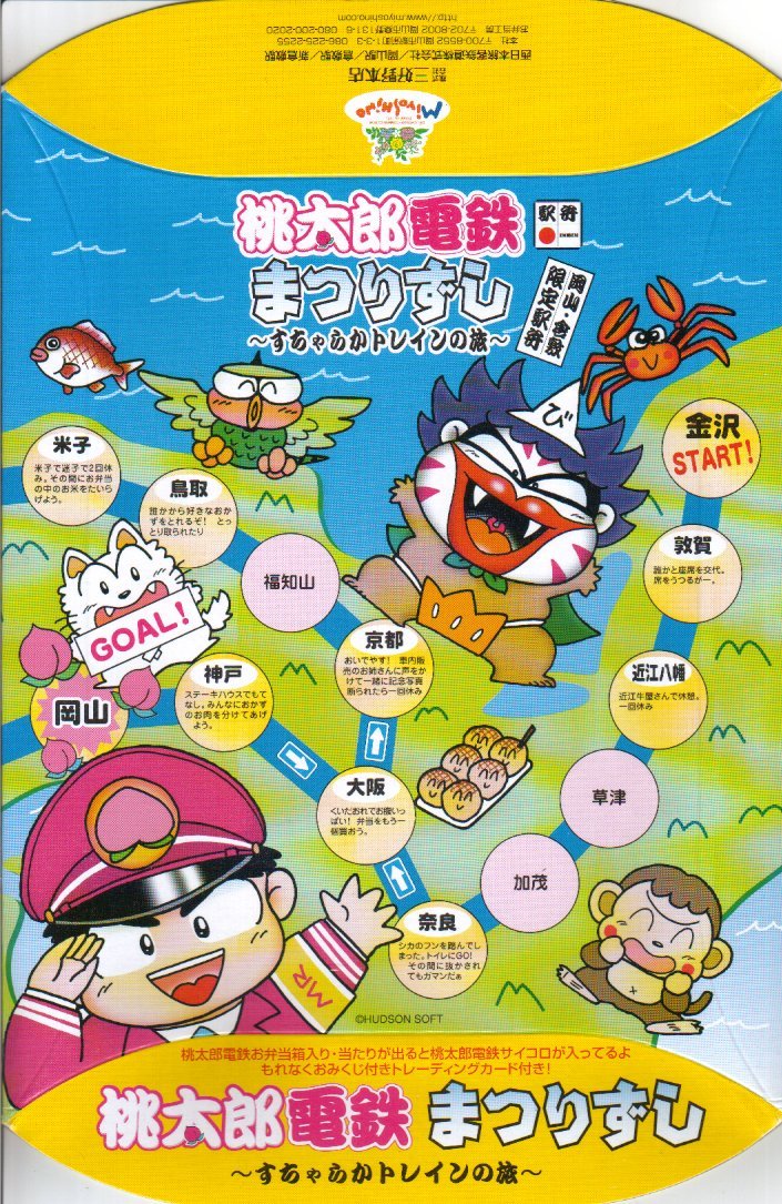 岡山駅弁名物の祭ずしを、桃太郎電鉄のキャラクターをデザインした容器に入れ、JR西日本エリアが舞台のすごろくとなるパッケージに収めた。100ポイント集めると駅弁1,000円分と交換できるという、ポイント付桃太郎電鉄トレーディングカードが入り、当たりが出るとサイコロが入っているというから、筆者が購入したものは当たりだった模様。味はおなじみのまつりずし。現在は売られていない模様。