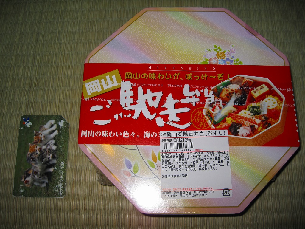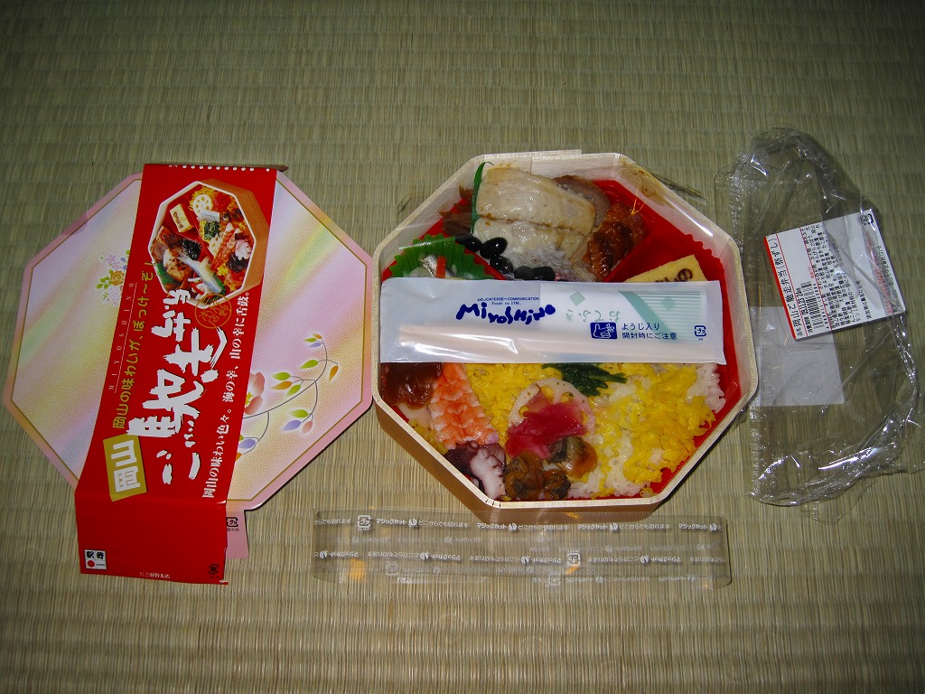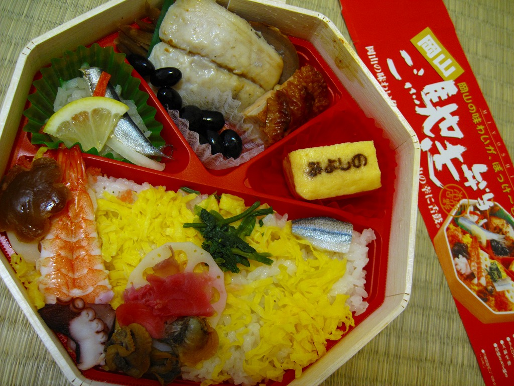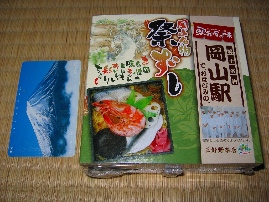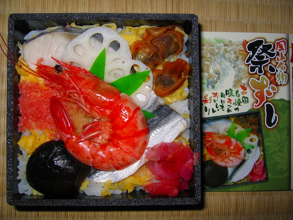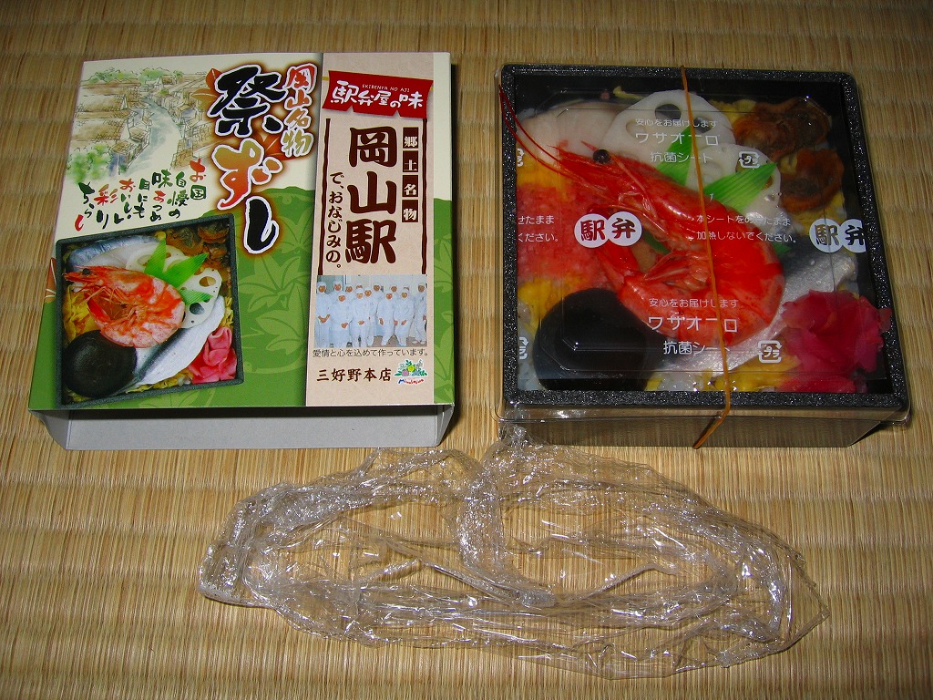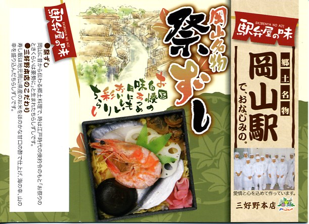 岡山駅の駅弁売り場で買えるお弁当。市販の時刻表では岡山駅の駅弁としてこの名を記すが、どうもこれは駅弁というよりはむしろ仕出し弁当であり、調製元の公式サイトではそんな扱いだった。小柄な長方形の容器をふたつ重ねて、その高さだけあるボール紙で上から包む。中身は下段が岡山駅弁名物まつりずし、上段がおかずで海老天や玉子焼や海老団子や肉団子など。味は駅弁と変わらない。