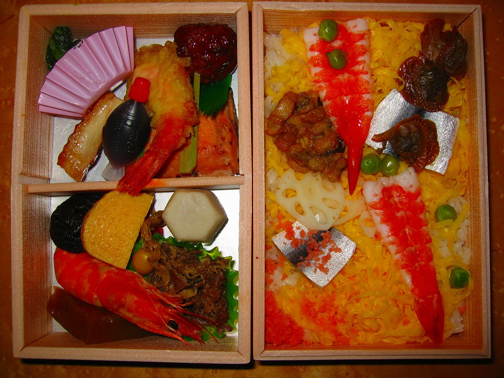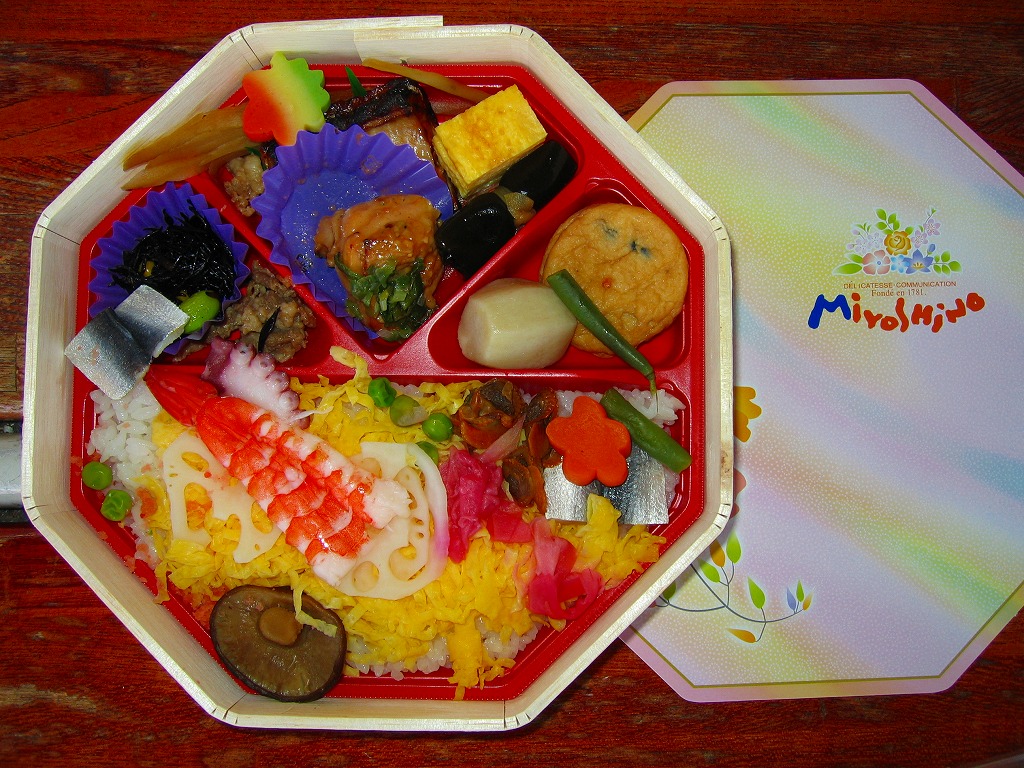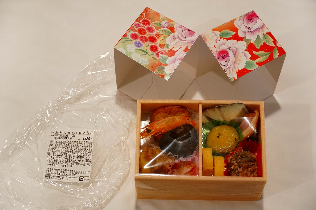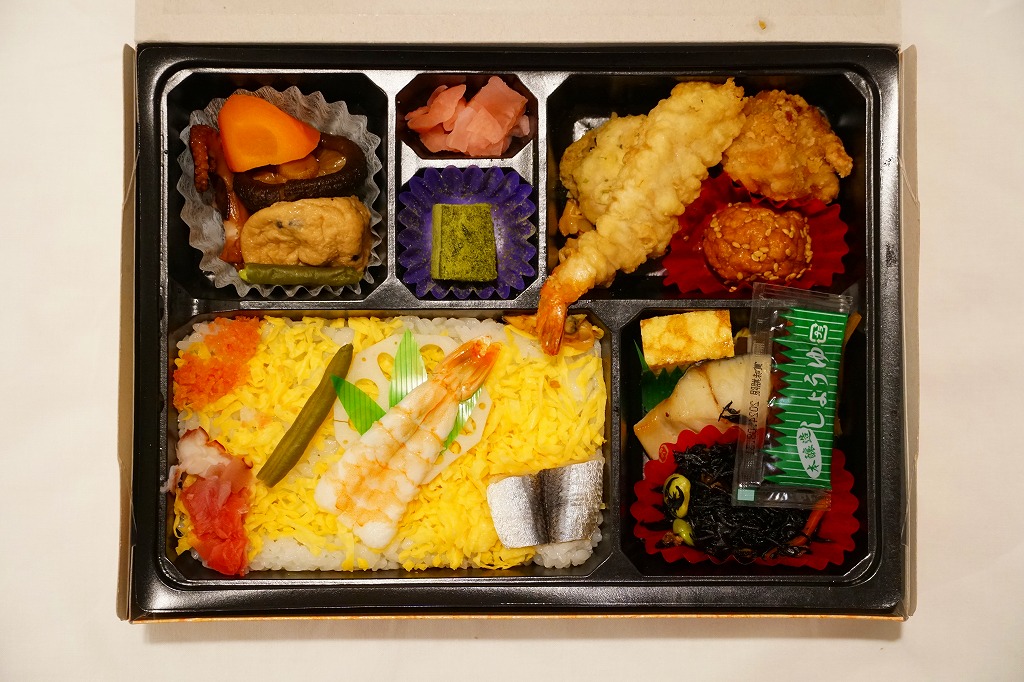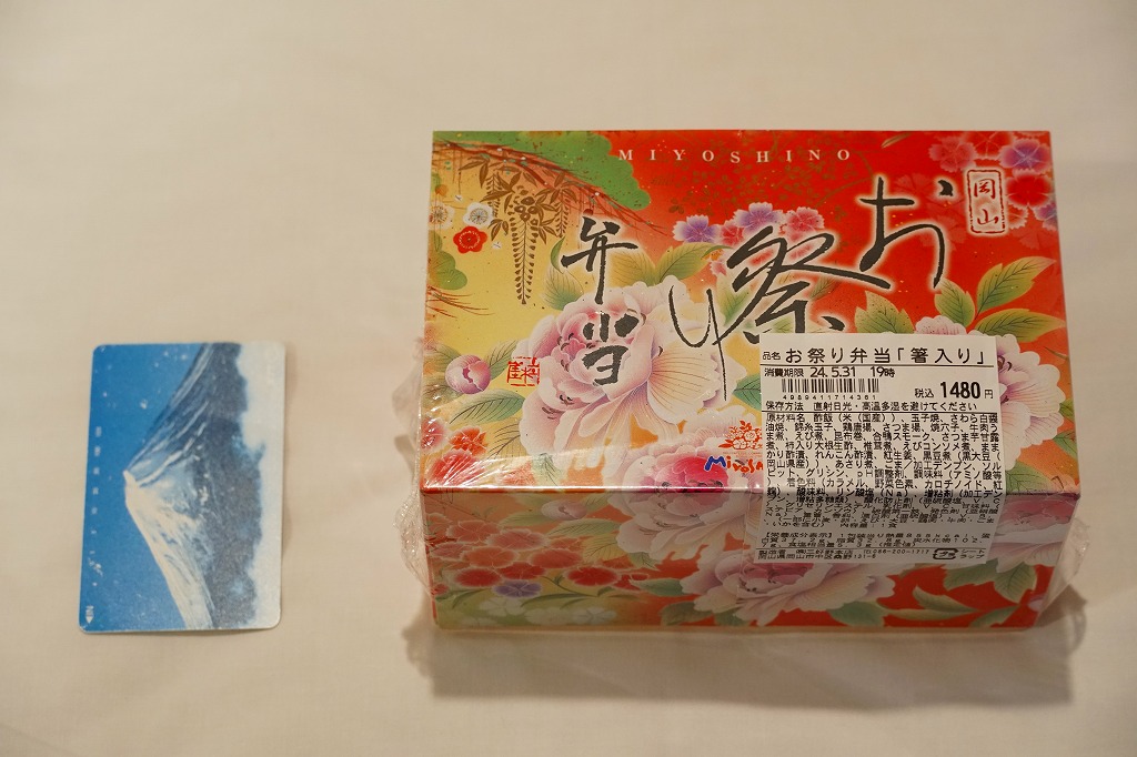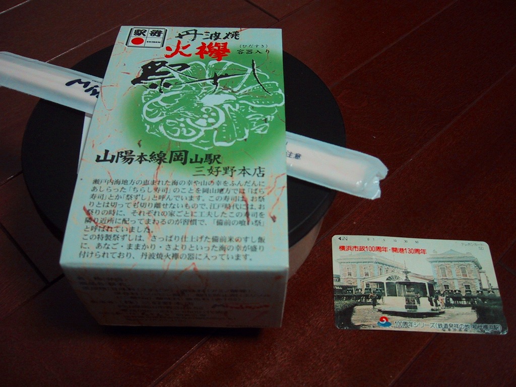 岡山駅の駅弁売り場で買えるお弁当。市販の時刻表では岡山駅の駅弁としてこの名を記すが、どうもこれは駅弁というよりはむしろ仕出し弁当であり、調製元の公式サイトではそんな扱いだった。小柄な長方形の容器をふたつ重ねて、その高さだけあるボール紙で上から包む。中身は下段が岡山駅弁名物まつりずし、上段がおかずで海老天や玉子焼や海老団子や肉団子など。味は駅弁と変わらない。