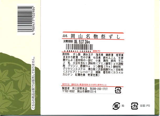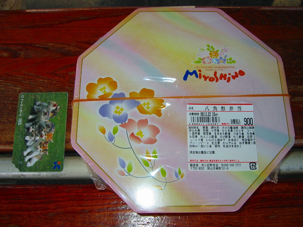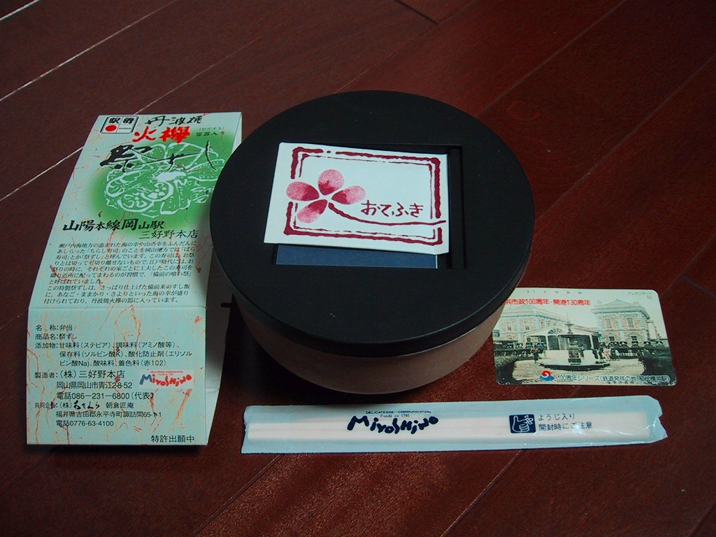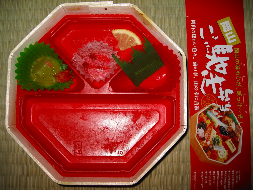 2007年までには発売していた模様。正八角形の経木枠の容器に、調製元汎用のボール紙のふたをして、輪ゴムで留めてラップで包んで食品表示ラベルを表裏に貼り、大阪と岡山の名物駅弁の名前を足して2で割ったような名前を付ける。
