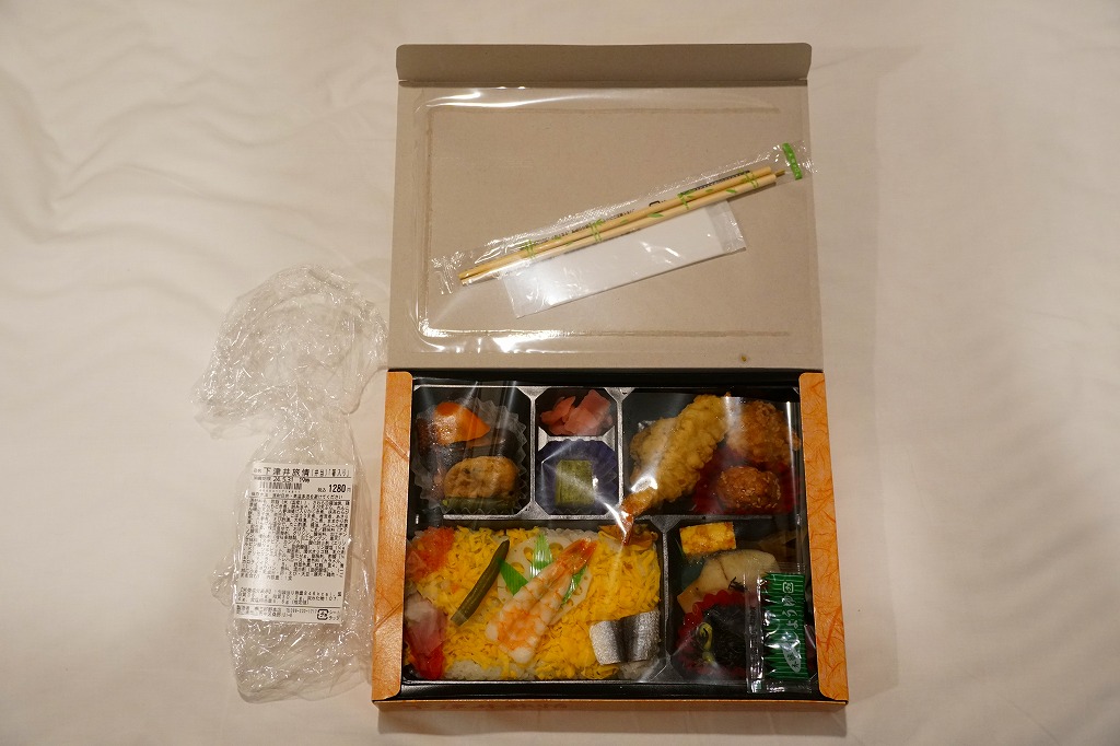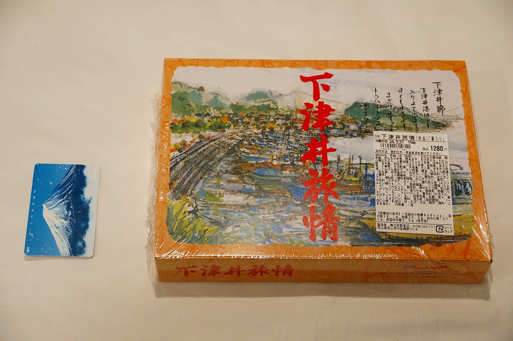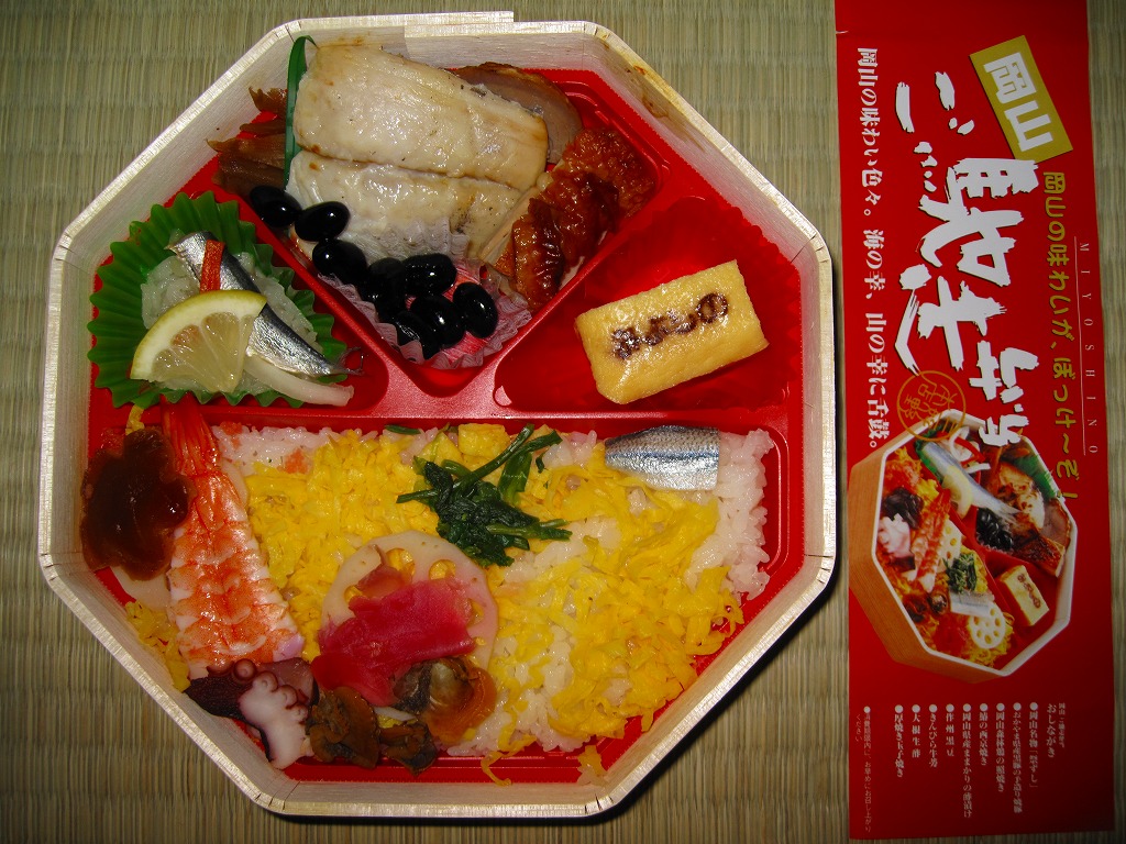 岡山駅でよく売れているという幕の内弁当。黒いプラ製トレーを、下津井港を描いたボール紙製の専用容器に詰めて、ラップで包んで食品表示ラベルを貼る。中身は祭ずしにイイダコやタケノコなどの煮物、エビの天ぷらやレンコン磯部揚、サワラの白焼きや玉子焼、肉団子に大学芋にワラビ餅など。内容が岡山らしく、多種多様な味も楽しめる。価格は2009年時点で1,050円、2014年4月の消費税率改定で1,080円、2022年8月から1,180円、2023年6月から1,280円。