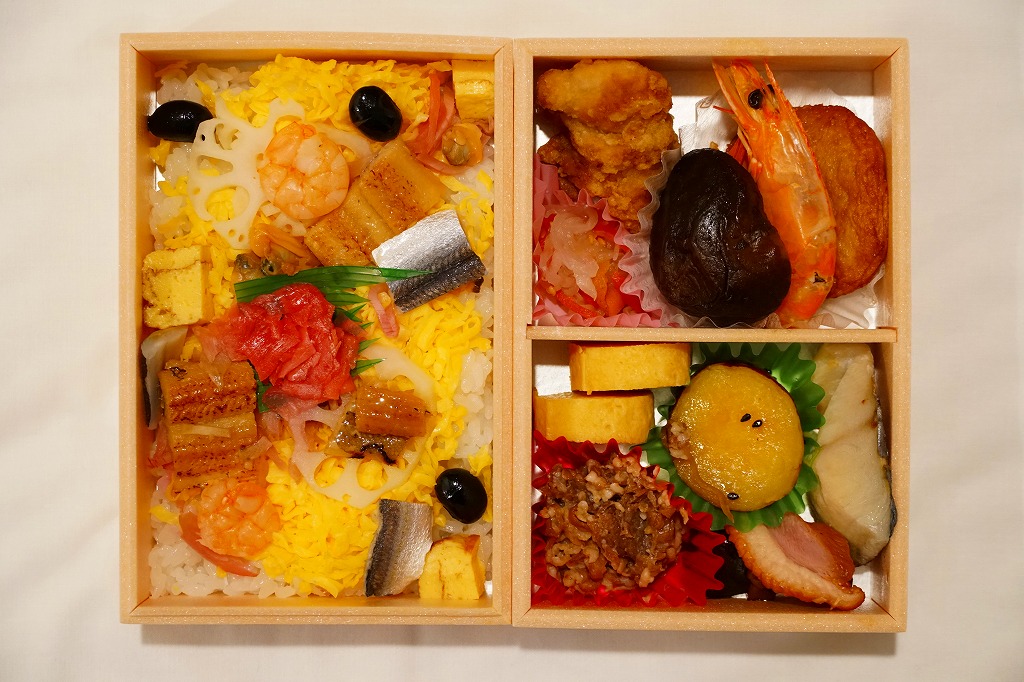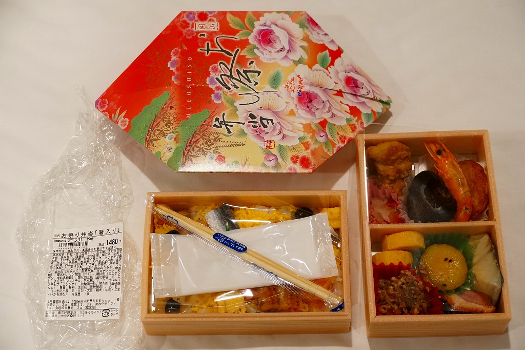 赤いプラ製トレーに収まる中身は、半分が岡山駅弁名物の祭ずし、半分が焼醤油鮭、鶏肉山賊焼、牛肉うま煮、昆布巻にがんもどきにサトイモやゴボウなどの煮物、玉子焼、ひじきなど。つまり、祭ずしにおかずを付けたもので、駅弁でも街弁としても活躍できそうなタイプ。価格は2008年の購入時で900円、2014年4月の消費税率改定で930円、2019年時点で900円、2022年8月から1,000円。2023年6月15日限りで終売。