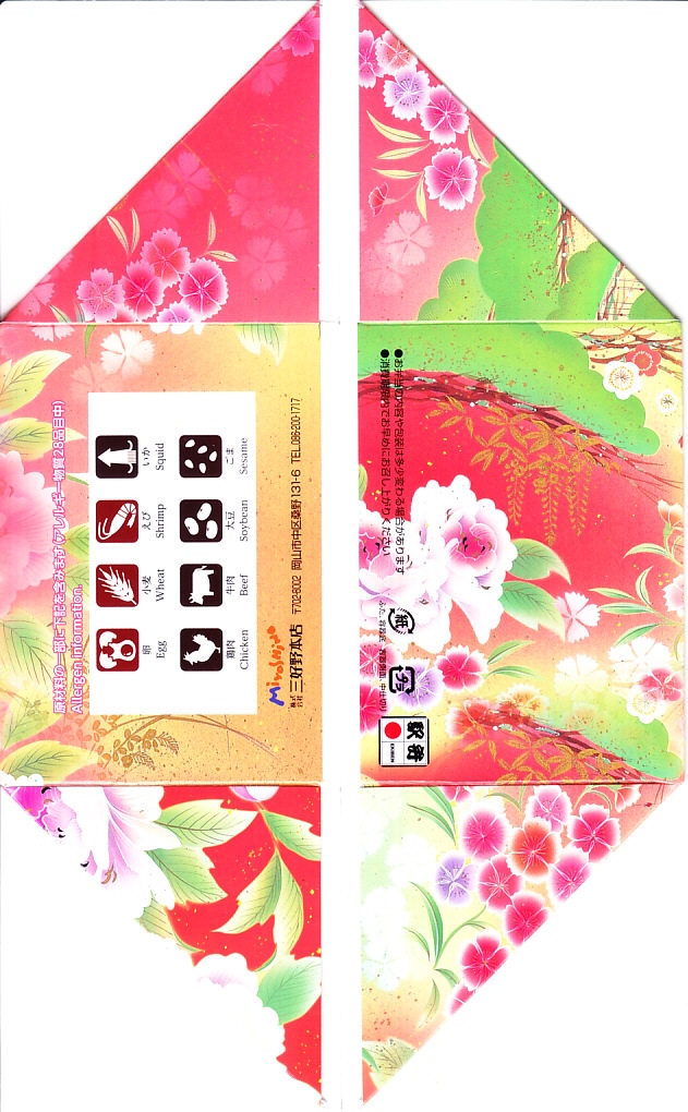2009(平成21)年9月14日に発売か。正八角形の経木折に、調製元の仕出し弁当用と思われるボール紙のふたをして、駅弁の名前と中身の写真を印刷した赤い紙帯を締めて透明な帯で留め、ラップで巻いてから表面と裏面に食品表示ラベルを貼る。赤いプラ製トレーに収まる中身は、酢飯の上にエビ、ママカリ、タコ、貝などを載せた、つまり岡山駅弁名物の祭ずしと、サワラ西京焼、鶏照焼、焼き豚、ママカリの酢の物、玉子焼、黒豆など。