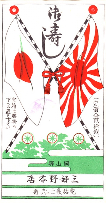 入手状況から1933(昭和8)年のものと思われる、昔の岡山駅弁の掛紙。「並等御辨當」と同じ絵柄。イベントの名前を書いてくれたら年代を特定できたのに。あるいは各イベントで使い回せる駅弁掛紙だったのか。