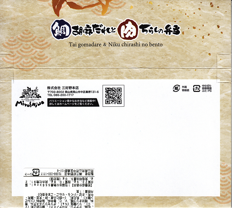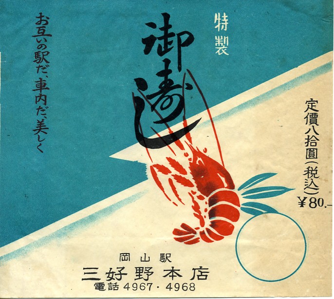 昭和20年代のものと思われる、昔の岡山駅弁の掛紙。漢字が右上スローガンの「駅」は新字体で価格は旧字体であるが、当時は両者が混用されていたのだろうか。