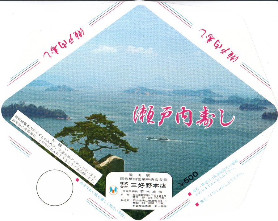 1982(昭和57)年に発売。長方形の容器の中にママカリのにぎり寿司が配列されている、シンプルな駅弁。ママカリとはニシン科の小魚で「さっぱ」とも呼ばれ、酢で締めると御飯を近所から借りてくるくらい食が進むので「ままかり」の名が付いたのだとか。岡山の駅弁にはたいてい入っている。埋立の進展で、岡山駅は海からかなり遠くなった。2013年頃に終売か。