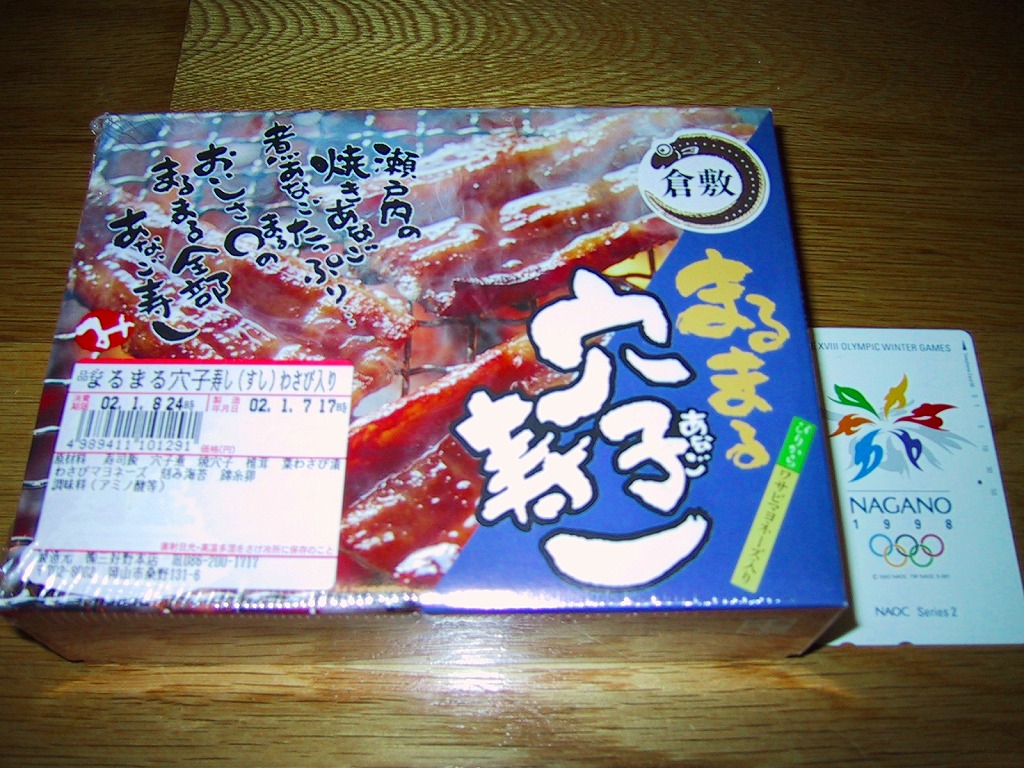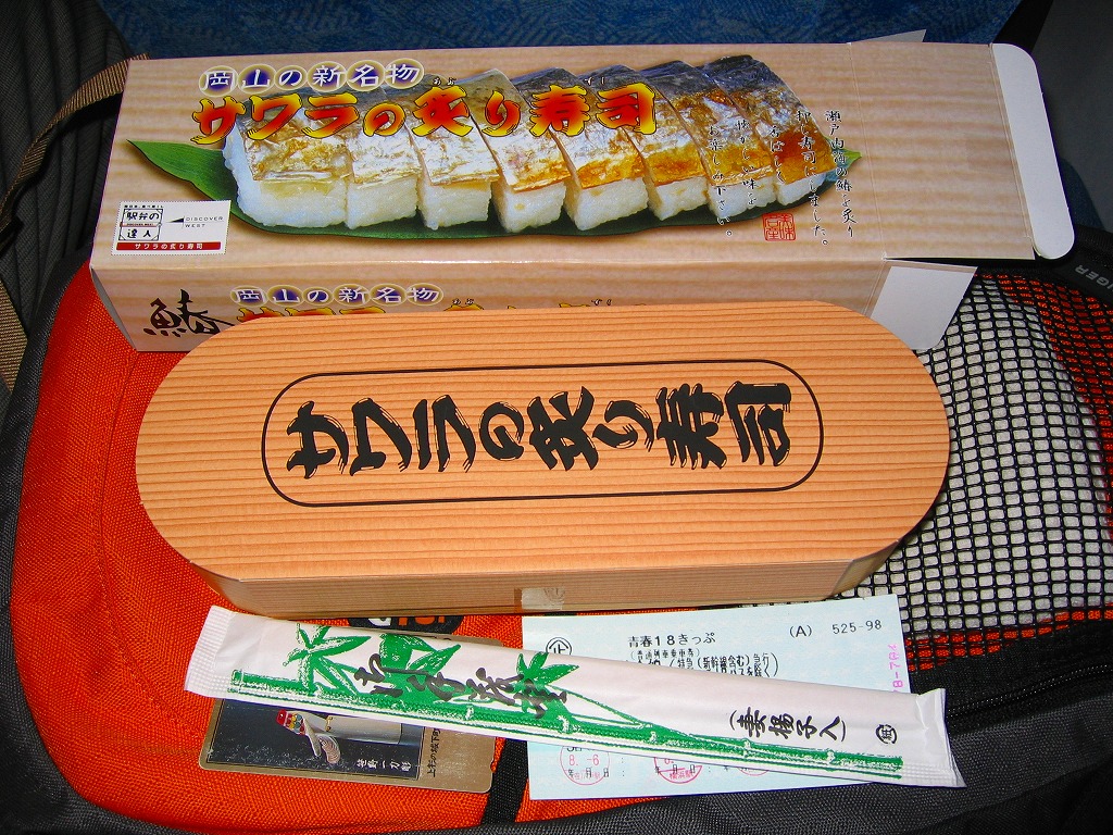 ふたと底面が紙製の長方形の容器を、まるで土産物のように糊付包装紙でしっかり包むので、うまくはがせずボロボロになった。中身は駅弁では珍しくさび抜きでない、小鯛二個・さわら二個・ままかり三個の、岡山県産朝日米での握り寿司。