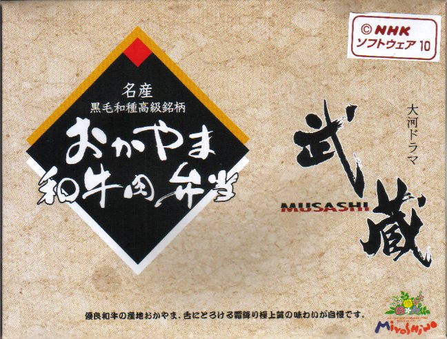 2003年のNHK大河ドラマ「武蔵MUSASHI」放送に先立ち、2002(平成14)年12月2日に「おかやま和牛肉弁当武蔵」の名で発売。コンパクト感のある経木枠の容器に公式ロゴを印刷したボール紙のふたをする。中身は酢飯の上に錦糸卵と岡山県北部産の黒毛和牛の時雨煮が載るもの。酢飯に牛肉という組み合わせは個人的に好まないが、他の駅の駅弁でも存在するし最近は郊外型回転寿司チェーンで流れていたりするので、合うと思う人が多いのだろう。やや少量にして高品質な駅弁。武蔵の二刀流を表現した2本のプラスティックナイフは、たぶん飾りもの。現在は売られていない模様。