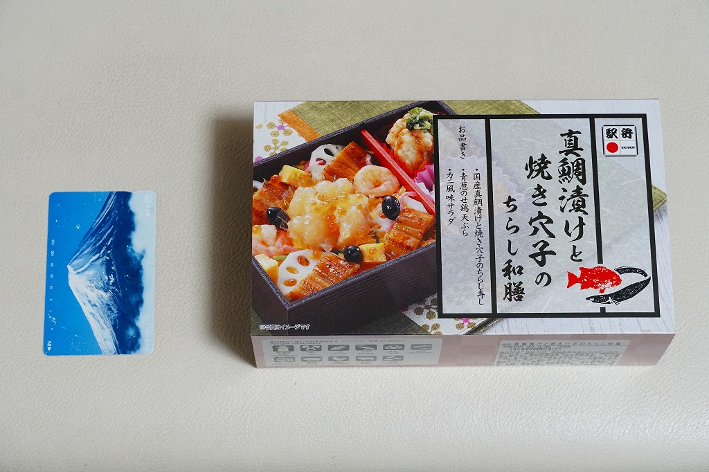 秋冬の駅弁大会シーズンに向けた、2021(令和3)年秋の新商品か。四角い容器に酢飯を詰め、錦糸卵で覆い、真鯛の醤油漬け、焼穴子、えび、いくら、玉子焼、れんこん、黒豆を散らし、鶏肉天ぷら、かに風味かまぼこ、にんじんを添える。名物か名産なのか何なのか、よくわからないけれど食べておいしかったと思えるお弁当。2022年7月限りで終売。