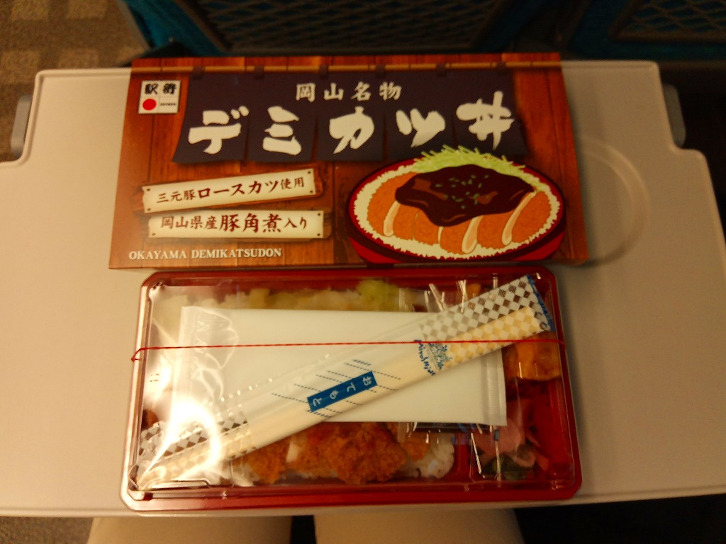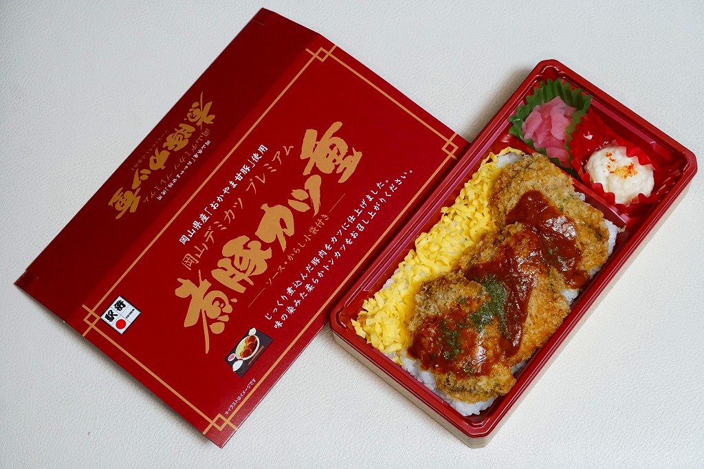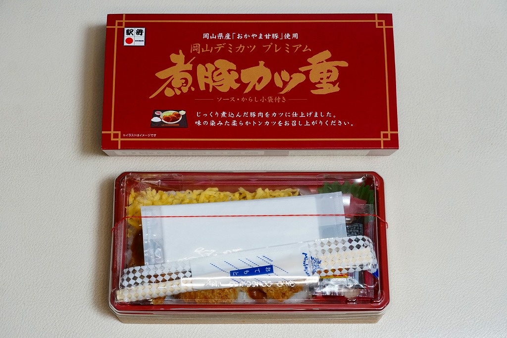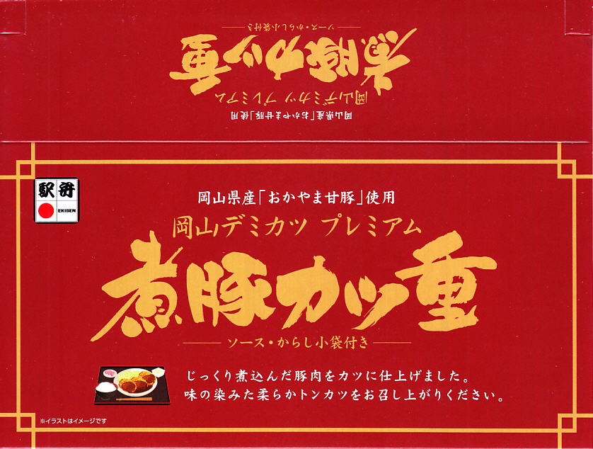 2020(令和2)年1月に発売、同月の京王百貨店の駅弁大会で実演販売。岡山のご当地グルメとして売り出し中のデミカツ丼が、単独で駅弁になった。ロースカツにデミグラスソースを掛けて白飯に載せ、グリーンピースで彩り、豚角煮と昆布巻と漬物を添える。ソースを含めて3タイプの肉でガツンと来る内容。岡山では昭和時代から、カツ丼といえばこういうデミグラスソースかけを指すらしく、ご当地グルメ時代になり「デミカツ丼」と呼び始めた。価格は2020年の発売時や2021年の購入時で1,100円、2020年の秋までに780円へ値下げ。2021年までの販売か。