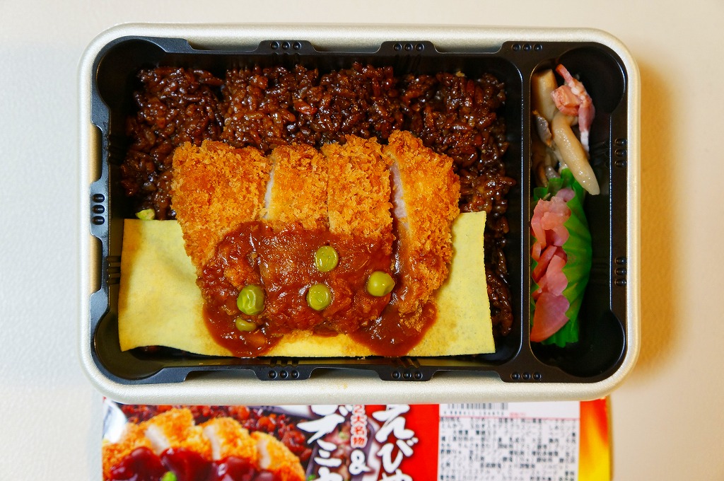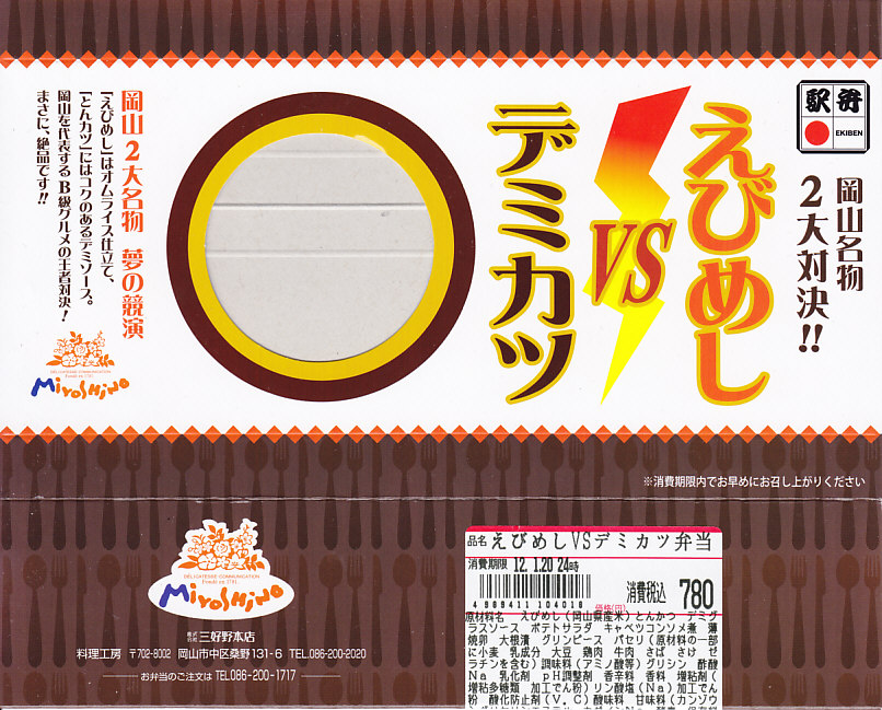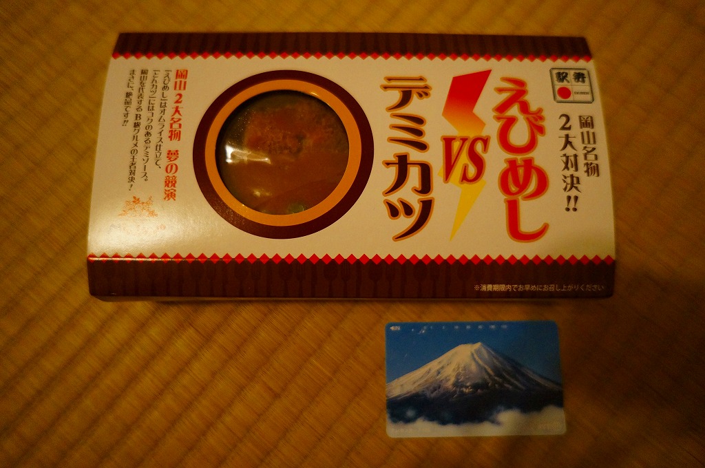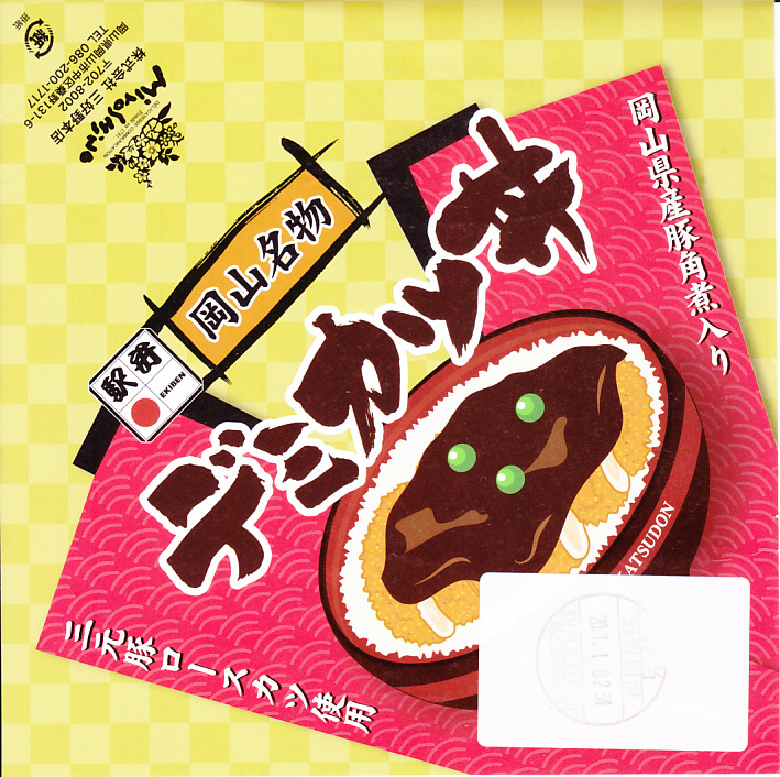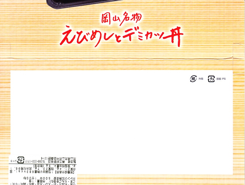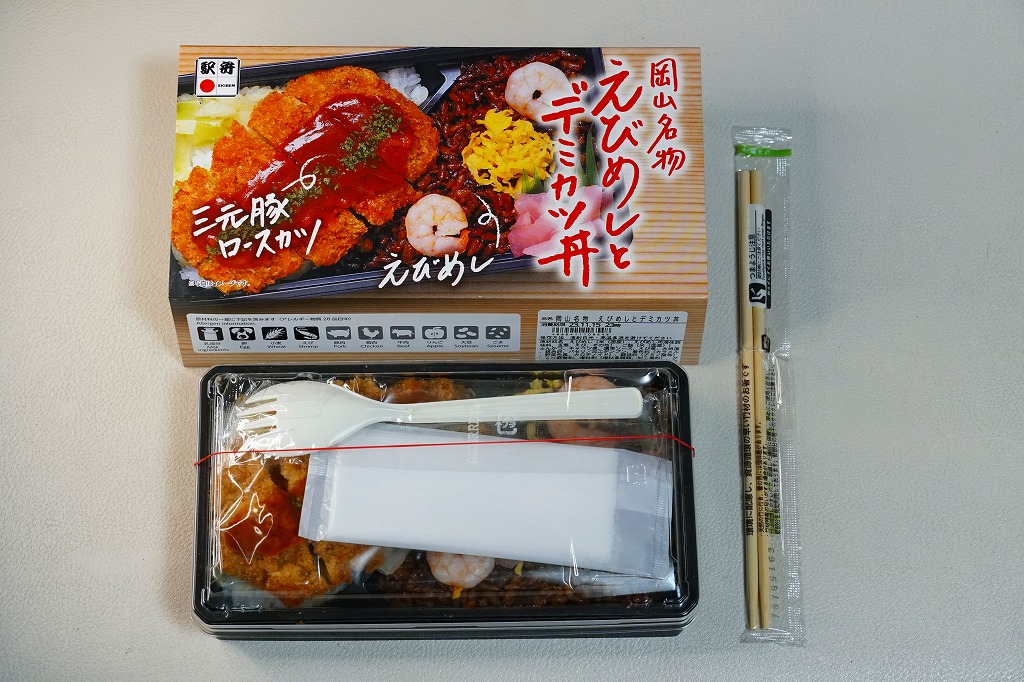 2011(平成23)年4月15日の発売。電子レンジ対応タイプな白いプラ製容器に透明なふたをして、商品名と宣伝文を書いたカツが見えるボール紙の枠にはめる。中身はパッケージの側面くらい濃いソース色でパラパラのえびめしの上を薄焼き玉子で覆い、デミグラスソースをべったり塗ったトンカツを載せ、ポテトサラダと大根漬を添えるもの。いずれも岡山の味、ということは岡山以外に広まらないのだろうが、レンジで温めるとよりB級グルメ感が増す感じ。駅弁としては安価なこともB級グルメ感あり。価格は2012年の購入時で780円、2014年4月の消費税率改定で800円。2016年2月に「岡山名物えびめしとデミカツ丼」へリニューアルし、2020年まで販売か。
