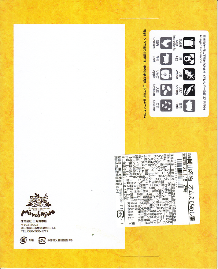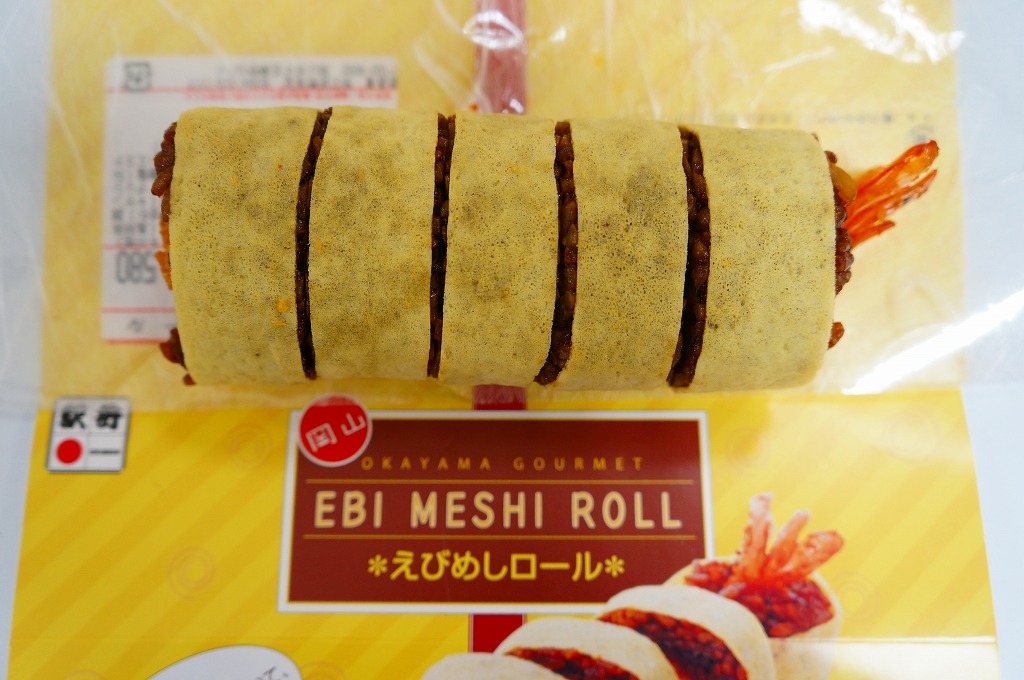 2011(平成23)年の発売か。エビフライをソース色の岡山名物えびめしで巻き、さらに薄焼き卵で巻いて、パッケージの写真のとおり5切れにカットして、タルタルソースや伸縮する箸を付けて、黄色い紙箱に収める。現地で買って食べてうまかったという話は聞かないが、ていねいに作られたB級グルメは駅弁催事では大好評で、よく売り切れている。価格は2013年の購入時で580円、2014年4月の消費税率改定で630円。2014年までの販売か。