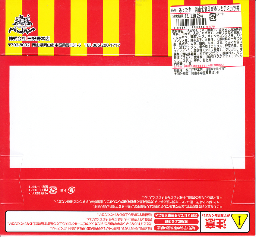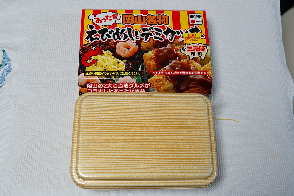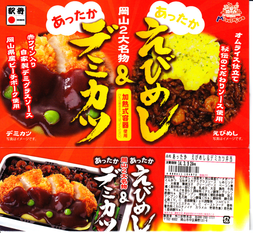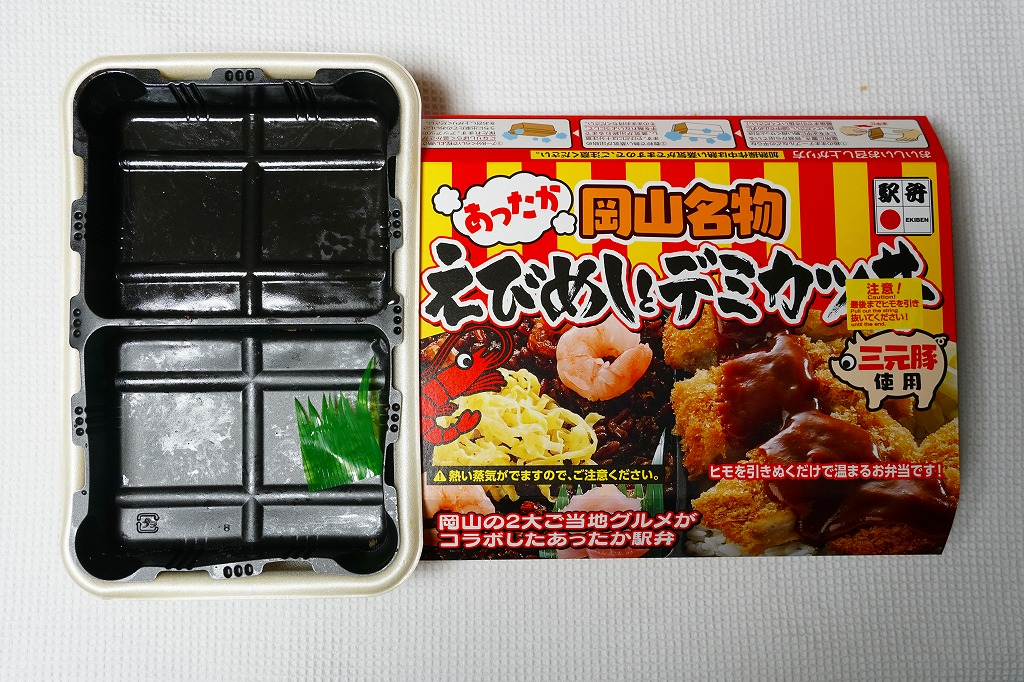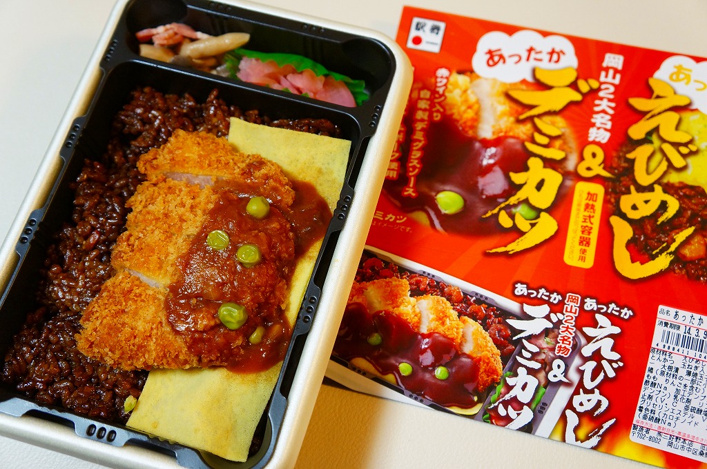 2016(平成28)年8月に下記の駅弁「あったかえびめし&あったかデミカツ」をリニューアル。四角い加熱機能付き容器の構造はそのままに、スリーブの絵柄をより派手に変え、中身は2区画に岡山名物とするえびめしとデミカツをそれぞれ詰めるものに変更した。真っ黒なエビ飯とB級なカツ飯は、引き続き上質なジャンクフードだと思う。