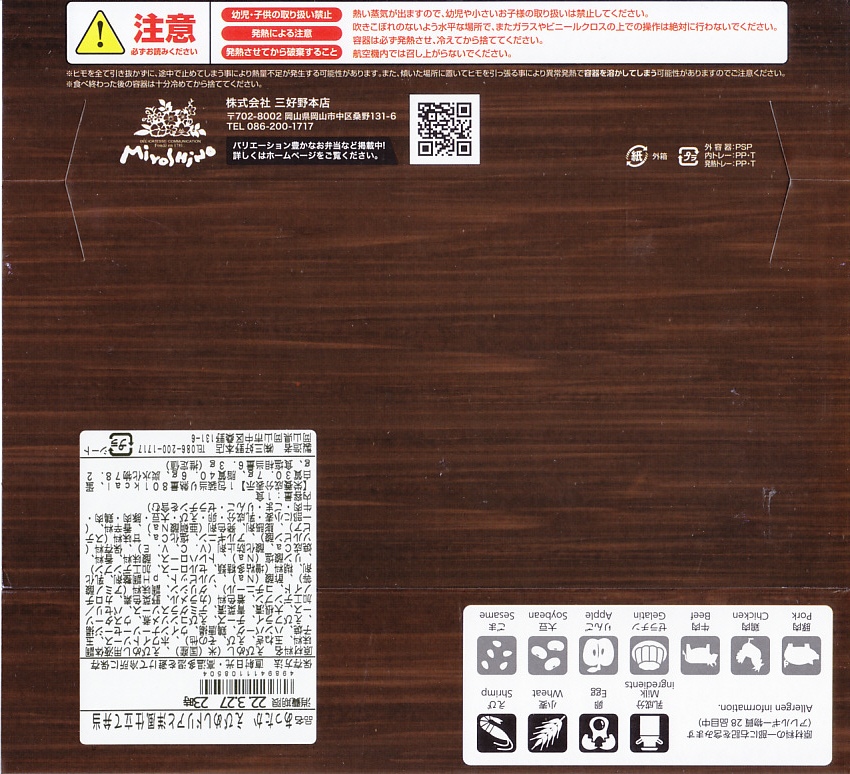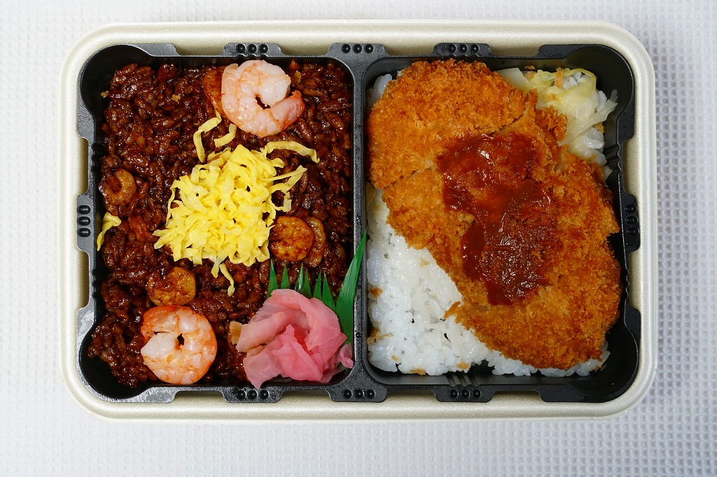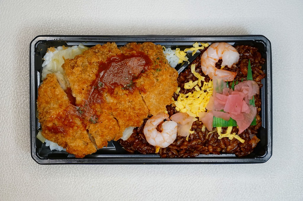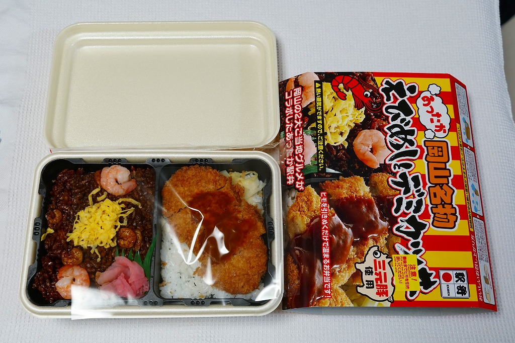 2023(令和5)年7月に岡山駅で発売か。「えびめしとデミカツ」という岡山駅弁は、下記のとおり2011年から数種類が出てきており、新商品という感じがしない。長方形のプラ容器の2区画に、黒いえびめしにエビと錦糸卵と大根桜漬を載せた「えびめし」と、白飯に濃厚ソースをかけた三元豚ロースカツとキャベツ煮を載せた「デミカツ丼」を収める。そんな内容は、2016年にリニューアルした加熱機能付き容器のものと、ほとんど同じ。味も変わらない。この間に駅弁の価格は1割から3割ほど上昇した感じなので、千円を切る価格での輸送販売はお徳に思えた。