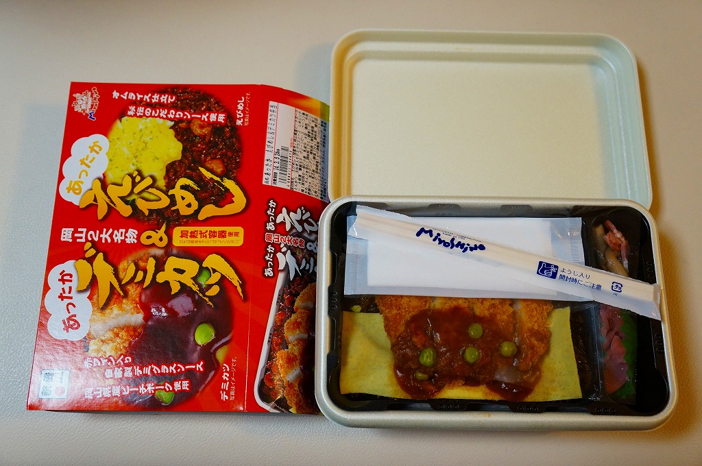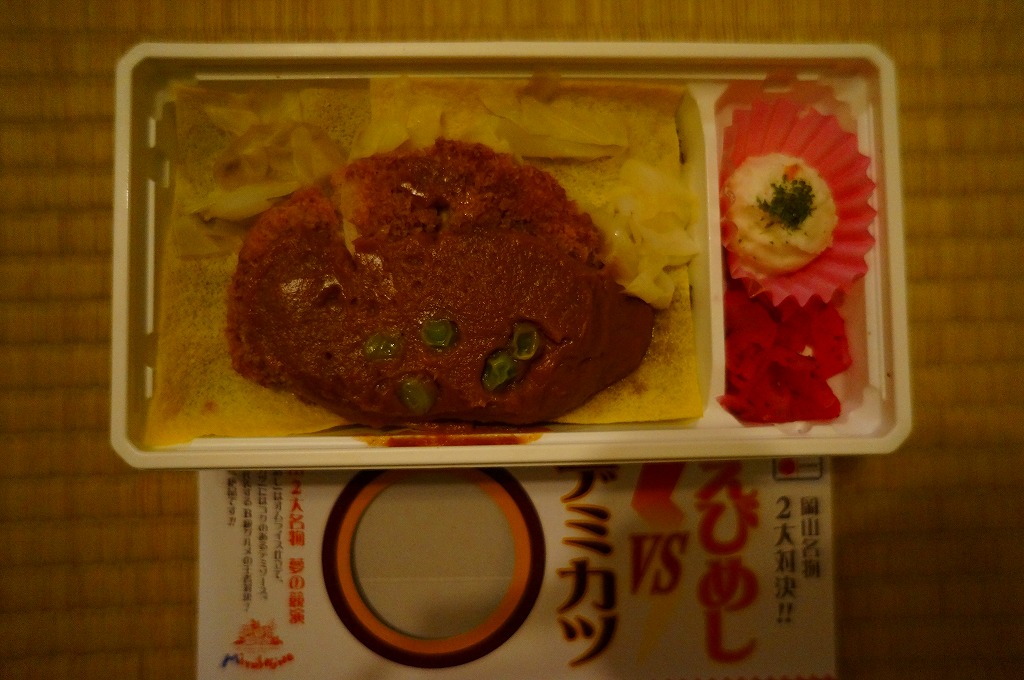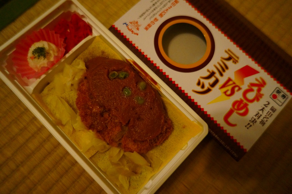 2013(平成25)年12月の発売。従前の岡山駅弁「えびめしVSデミカツ」を加熱機能付き容器に詰めたものだろうが、パッケージも内容も、見た目はだいぶ異なる。長方形の加熱機能付き容器に、真っ黒なえびめしを詰め、玉子のシートを貼り、とんかつを置き、デミグラスソースをかけ、しめじのソテーと大根桜漬を添える。岡山以外ではきっとなじみのない料理を、パッケージと中身とその味で分かりやすく紹介する、上質なジャンクフード。2016年8月に上記の「あったかえびめしとデミカツ丼」へリニューアル。