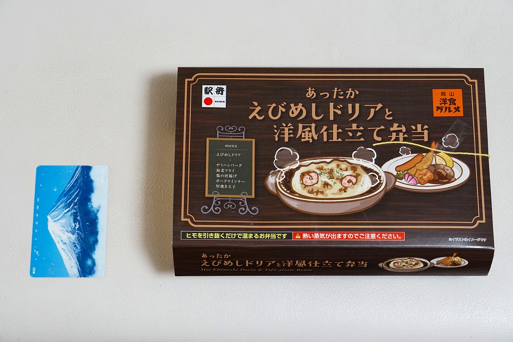 2021(令和3)年9月に発売。四角い加熱機能付き容器を収めたスリーブには、えびめしドリアとハンバーグなどを描く。中身は1区画でえびめしドリア、もう1区画でデミハンバーグ、海老フライ、鶏の唐揚げ、ポークウインナー、厚焼き玉子、大根漬と青菜漬。ソースで黒く染まる御飯をホワイトソースとチーズで覆い海老を添える岡山のえびめしと、洋食のおかずと、玉子焼に漬物という和風の3要素を詰め合わせた、個性的な不思議ちゃん。全体的な印象としては、商品名どおりの洋風の弁当だと思う。2022年までの販売か。